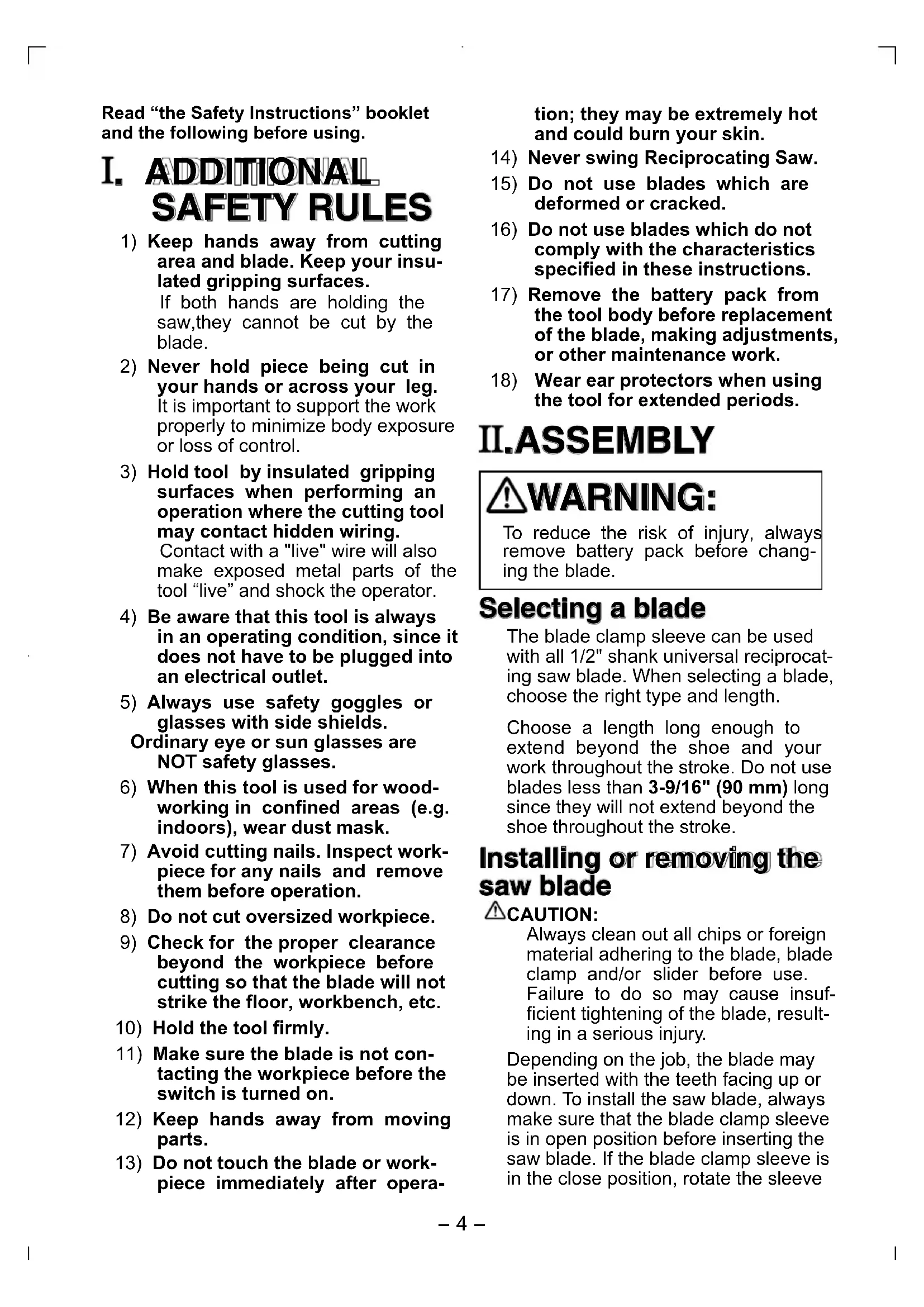 To reduce the risk of injury, always remove battery pack before chang- ing the blade. Selecting a blade The blade clamp sleeve can be used with all 1/2" shank universal reciprocat- ing saw blade. When selecting a blade, choose the right type and length. Choose a length long enough to extend beyond the shoe and your work throughout the stroke. Do not use blades less than 3-9/16" (90 mm) long since they will not extend beyond the shoe throughout the stroke. Installing or removing the saw blade CAUTION: Always clean out all chips or foreign material adhering to the blade, blade clamp and/or slider before use. Failure to do so may cause insuf- ficient tightening of the blade, result- ing in a serious injury. Depending on the job, the blade may be inserted with the teeth facing up or down. To install the saw blade, always make sure that the blade clamp sleeve is in open position before inserting the saw blade. If the blade clamp sleeve is in the close position, rotate the sleeve-