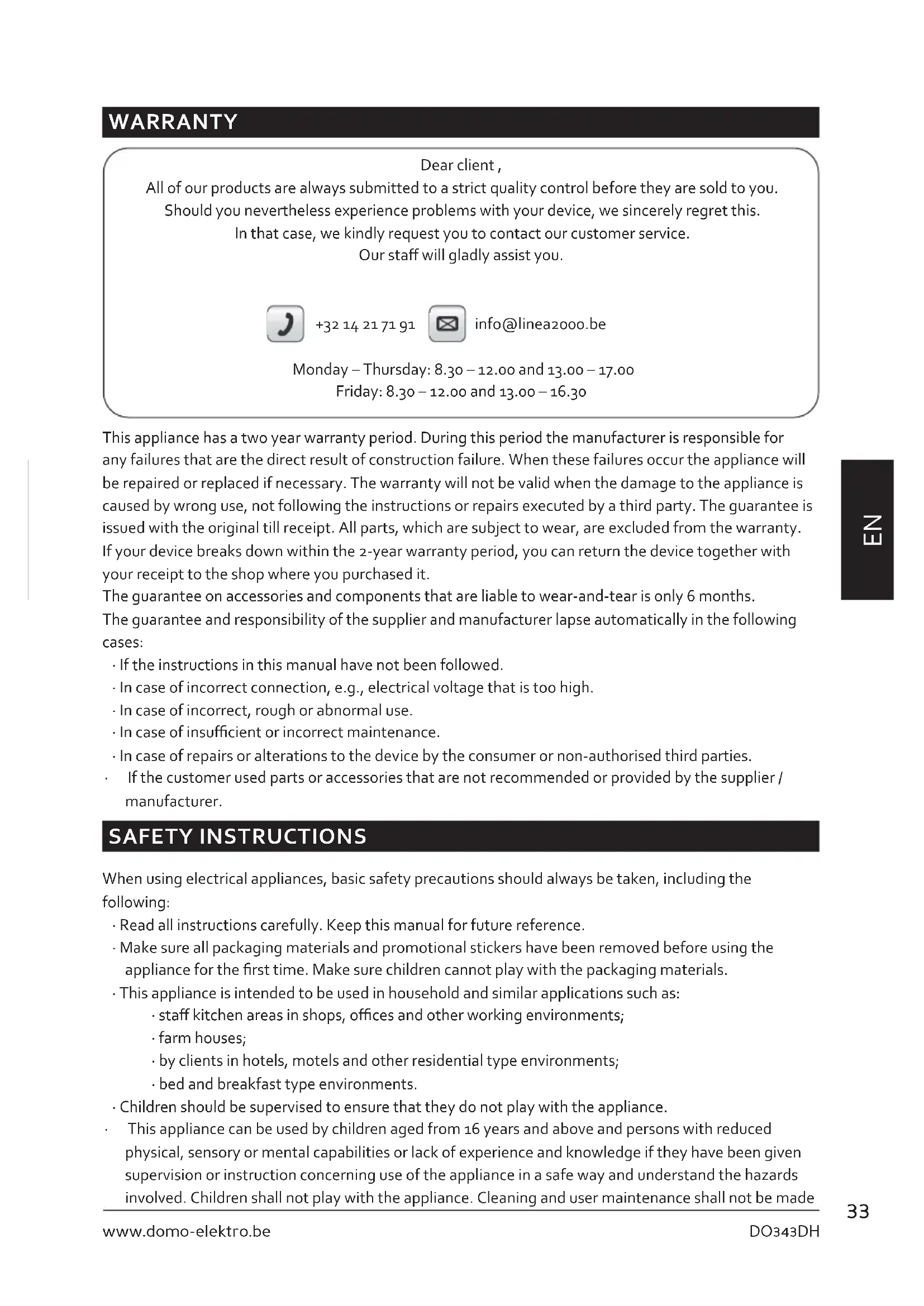 This appliance has a two year warranty period. During this period the manufacturer is responsible for any failures that are the direct result of construction failure. When these failures occur the appliance will be repaired or replaced if necessary. The warranty will not be valid when the damage to the appliance is caused by wrong use, not following the instructions or repairs executed by a third party. The guarantee is issued with the original till receipt. All parts, which are subject to wear, are excluded from the warranty. If your device breaks down within the 2-year warranty period, you can return the device together with your receipt to the shop where you purchased it.