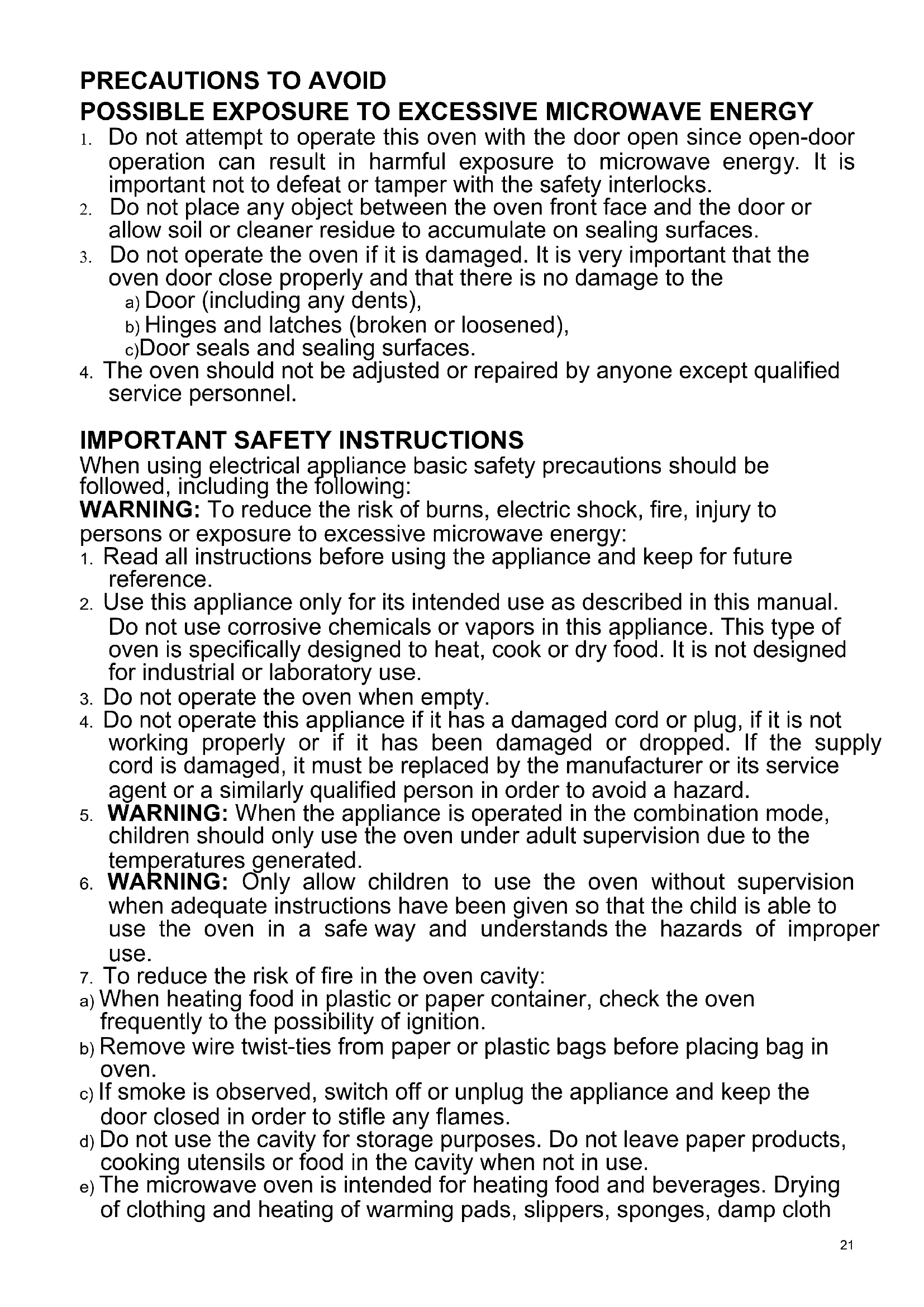 d) Do not use the cavity for storage purposes. Do not leave paper products, cooking utensils or food in the cavity when not in use.