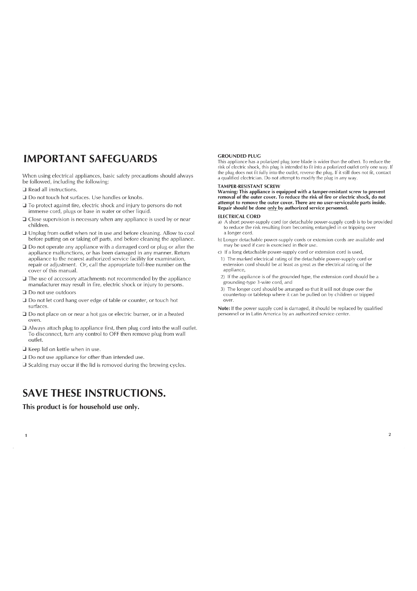 To protect against fire, electric shock and injury to persons do not immerse cord, plugs or base in water or other liquid.