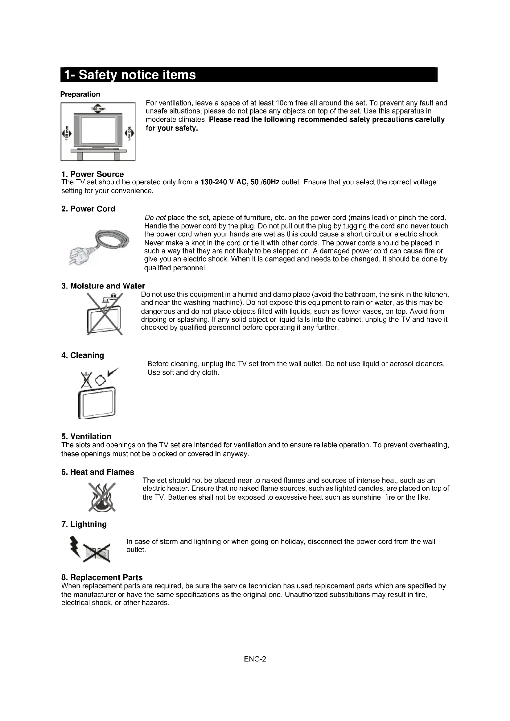 When replacement parts are required, be sure the service technician has used replacement parts which are specified by the manufacturer or have the same specifications as the original one. Unauthorized substitutions may result in fire, electrical shock, or other hazards.ENG-3