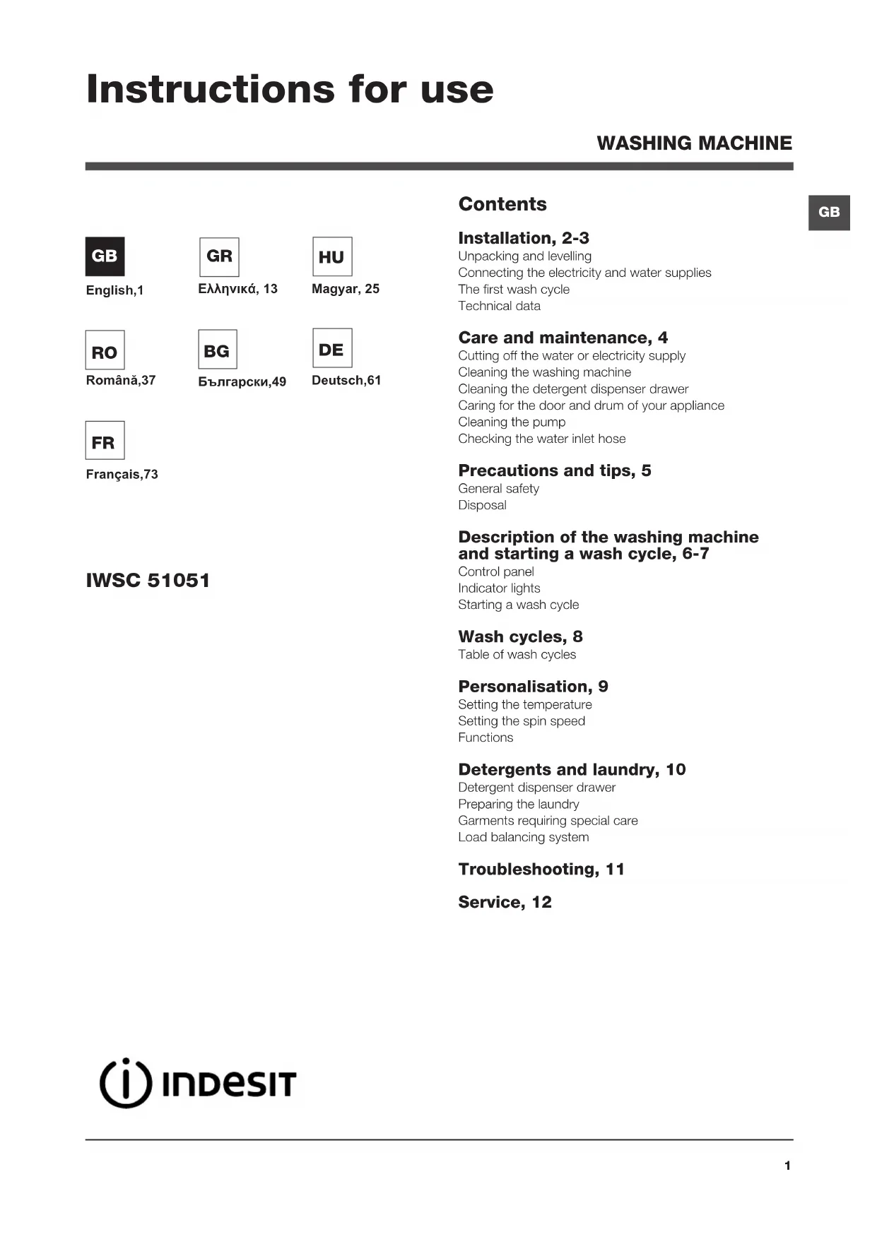 Contents Installation, 2-3 Unpacking and levelling Connecting the electricity and water supplies The first wash cycle Technical data Care and maintenance, 4 Cutting off the water or electricity supply Cleaning the washing machine Cleaning the detergent dispenser drawer Caring for the door and drum of your appliance Cleaning the pump Checking the water inlet hose Precautions and tips, 5 General safety Disposal Description of the washing machine and starting a wash cycle, 6-7 Control panel Indicator lights Starting a wash cycle Wash cycles, 8 Table of wash cycles Personalisation, 9 Setting the temperature Setting the spin speed Functions Detergents and laundry, 10 Detergent dispenser drawer Preparing the laundry Garments requiring special care Load balancing system Troubleshooting, 11 Service, 12 IWSC 51051 Instructions for use WASHING MACHINE English,1