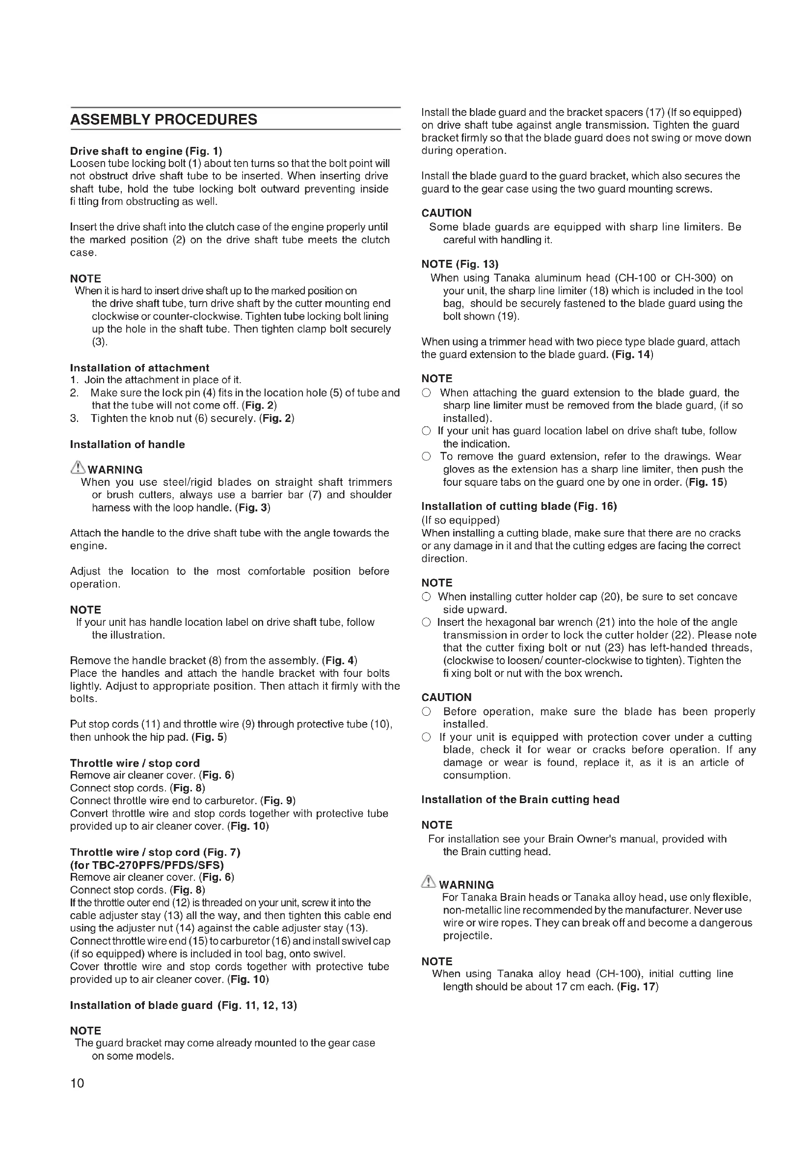 Installation of handle WARNING When you use steel/rigid blades on straight shaft trimmers or brush cutters, always use a barrier bar (7) and shoulder harness with the loop handle. (Fig. 3) Attach the handle to the drive shaft tube with the angle towards the engine. Adjust the location to the most comfortable position before operation. NOTE If your unit has handle location label on drive shaft tube, follow the illustration. Remove the handle bracket (8) from the assembly. (Fig. 4) Place the handles and attach the handle bracket with four bolts lightly. Adjust to appropriate position. Then attach it fi rmly with the bolts. Put stop cords (11) and throttle wire (9) through protective tube (10), then unhook the hip pad. (Fig. 5) Throttle wire / stop cord Remove air cleaner cover. (Fig. 6) Connect stop cords. (Fig. 8) Connect throttle wire end to carburetor. (Fig. 9) Convert throttle wire and stop cords together with protective tube provided up to air cleaner cover. (Fig. 10) Throttle wire / stop cord (Fig. 7) (for TBC-270PFS/PFDS/SFS) Remove air cleaner cover. (Fig. 6) Connect stop cords. (Fig. 8) If the throttle outer end (12) is threaded on your unit, screw it into the cable adjuster stay (13) all the way, and then tighten this cable end using the adjuster nut (14) against the cable adjuster stay (13). Connect throttle wire end (15) to carburetor (16) and install swivel cap (if so equipped) where is included in tool bag, onto swivel. Cover throttle wire and stop cords together with protective tube provided up to air cleaner cover. (Fig. 10) Installation of blade guard (Fig. 11, 12, 13) NOTE The guard bracket may come already mounted to the gear case on some models. Install the blade guard and the bracket spacers (17) (If so equipped) on drive shaft tube against angle transmission. Tighten the guard bracket fi rmly so that the blade guard does not swing or move down during operation. Install the blade guard to the guard bracket, which also secures the guard to the gear case using the two guard mounting screws. CAUTION Some blade guards are equipped with sharp line limiters. Be careful with handling it. NOTE (Fig. 13) When using Tanaka aluminum head (CH-100 or CH-300) on your unit, the sharp line limiter (18) which is included in the tool bag, should be securely fastened to the blade guard using the bolt shown (19). When using a trimmer head with two piece type blade guard, attach the guard extension to the blade guard. (Fig. 14) NOTE ○ When attaching the guard extension to the blade guard, the sharp line limiter must be removed from the blade guard, (if so installed). ○ If your unit has guard location label on drive shaft tube, follow the indication. ○ To remove the guard extension, refer to the drawings. Wear gloves as the extension has a sharp line limiter, then push the four square tabs on the guard one by one in order. (Fig. 15) Installation of cutting blade (Fig. 16) (If so equipped) When installing a cutting blade, make sure that there are no cracks or any damage in it and that the cutting edges are facing the correct direction. NOTE ○ When installing cutter holder cap (20), be sure to set concave side upward. ○ Insert the hexagonal bar wrench (21) into the hole of the angle transmission in order to lock the cutter holder (22). Please note that the cutter fi xing bolt or nut (23) has left-handed threads, (clockwise to loosen/ counter-clockwise to tighten). Tighten the fi xing bolt or nut with the box wrench. CAUTION ○ Before operation, make sure the blade has been properly installed. ○ If your unit is equipped with protection cover under a cutting blade, check it for wear or cracks before operation. If any damage or wear is found, replace it, as it is an article of consumption. Installation of the Brain cutting head NOTE For installation see your Brain Owner's manual, provided with the Brain cutting head. WARNING For Tanaka Brain heads or Tanaka alloy head, use only fl exible, non-metallic line recommended by the manufacturer. Never use wire or wire ropes. They can break off and become a dangerous projectile. NOTE When using Tanaka alloy head (CH-100), initial cutting line length should be about 17 cm each. (Fig. 17) 000BookTBC-270S.indb10000BookTBC-270S.indb10 2012/06/2116:41:582012/06/2116:41:58G