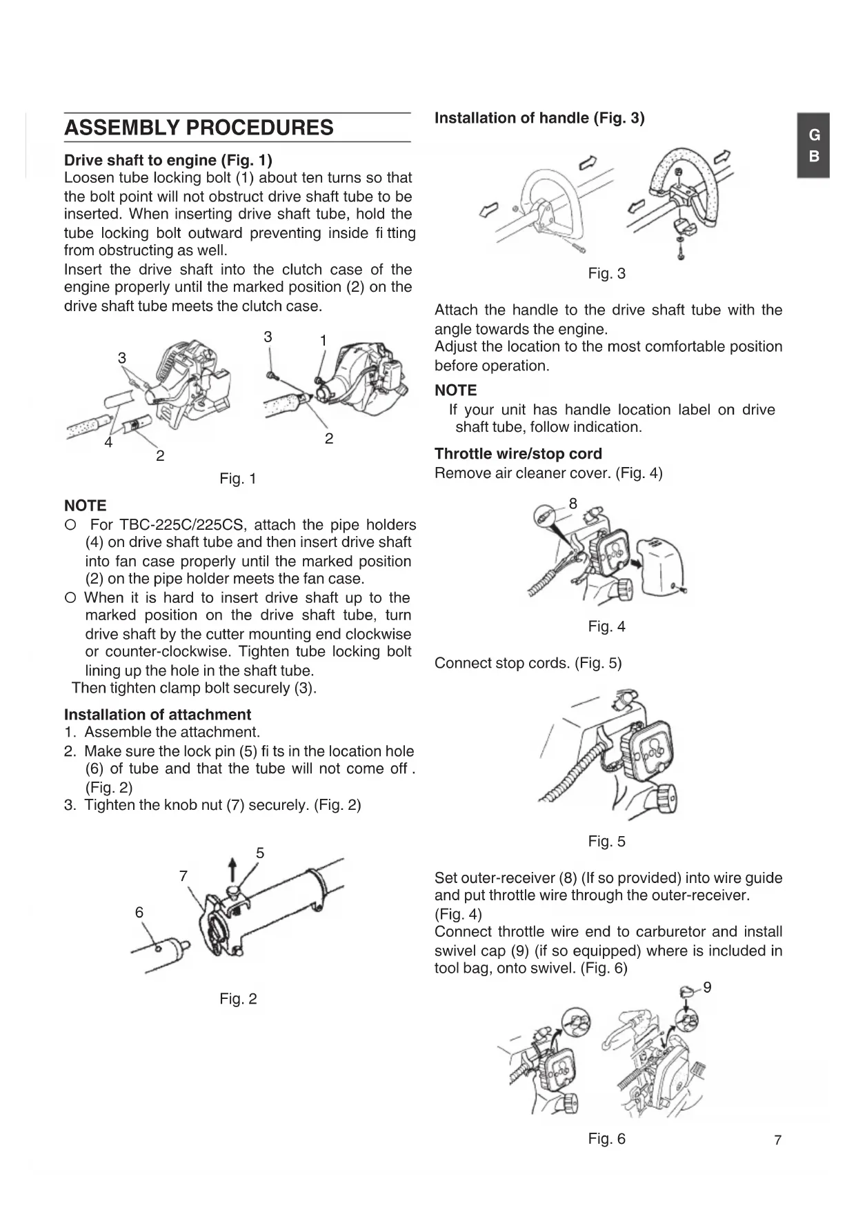 Fig. 6 000BookTBC-225.indb7000BookTBC-225.indb7 2012/10/2216:19:192012/10/2216:19:198 Cover throttle wire and stop cords together with protective tube provided up to air cleaner cover. (Fig. 7) Fig. 7 Installation of blade guard (Fig. 8, 9, 10, 11) Install the blade guard as shown in Fig. 8, 9, 10, 11. Fig. 8 Fig. 9 Fig. 10 Fig. 11 NOTE If your unit has guard location label on drive shaft tube, follow the indication. CAUTION ● Do not attempt to install metal blade on the curved shaft trimmer. It is very dangerous. ● Some blade guards are equipped with sharp line limiters. Be careful with handling it. Installation of cutting blade (Fig. 12) (If so equipped) When installing a cutting blade, make sure that there are no cracks or any damage to it and that the cutting edges are facing the correct direction.