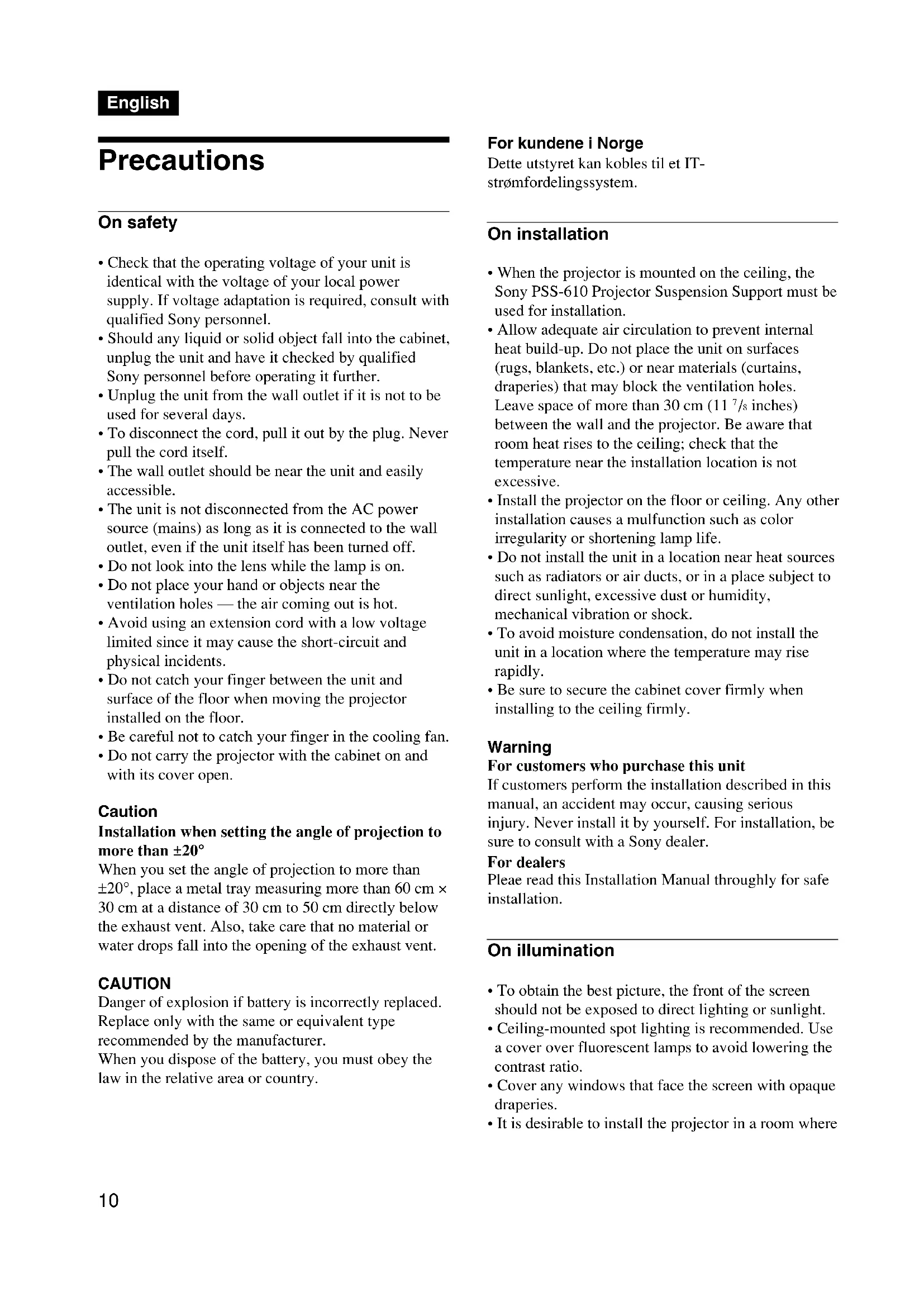 - Do not carry the projector with the cabinet on and with its cover open. Caution Installation when setting the angle of projection to more than ±20° When you set the angle of projection to more than ±20°, place a metal tray measuring more than 60 cm × 30 cm at a distance of 30 cm to 50 cm directly below the exhaust vent. Also, take care that no material or water drops fall into the opening of the exhaust vent. CAUTION Danger of explosion if battery is incorrectly replaced. Replace only with the same or equivalent type recommended by the manufacturer. When you dispose of the battery, you must obey the law in the relative area or country. For kundene i Norge Dette utstyret kan kobles til et IT- strømfordelingssystem. On installation