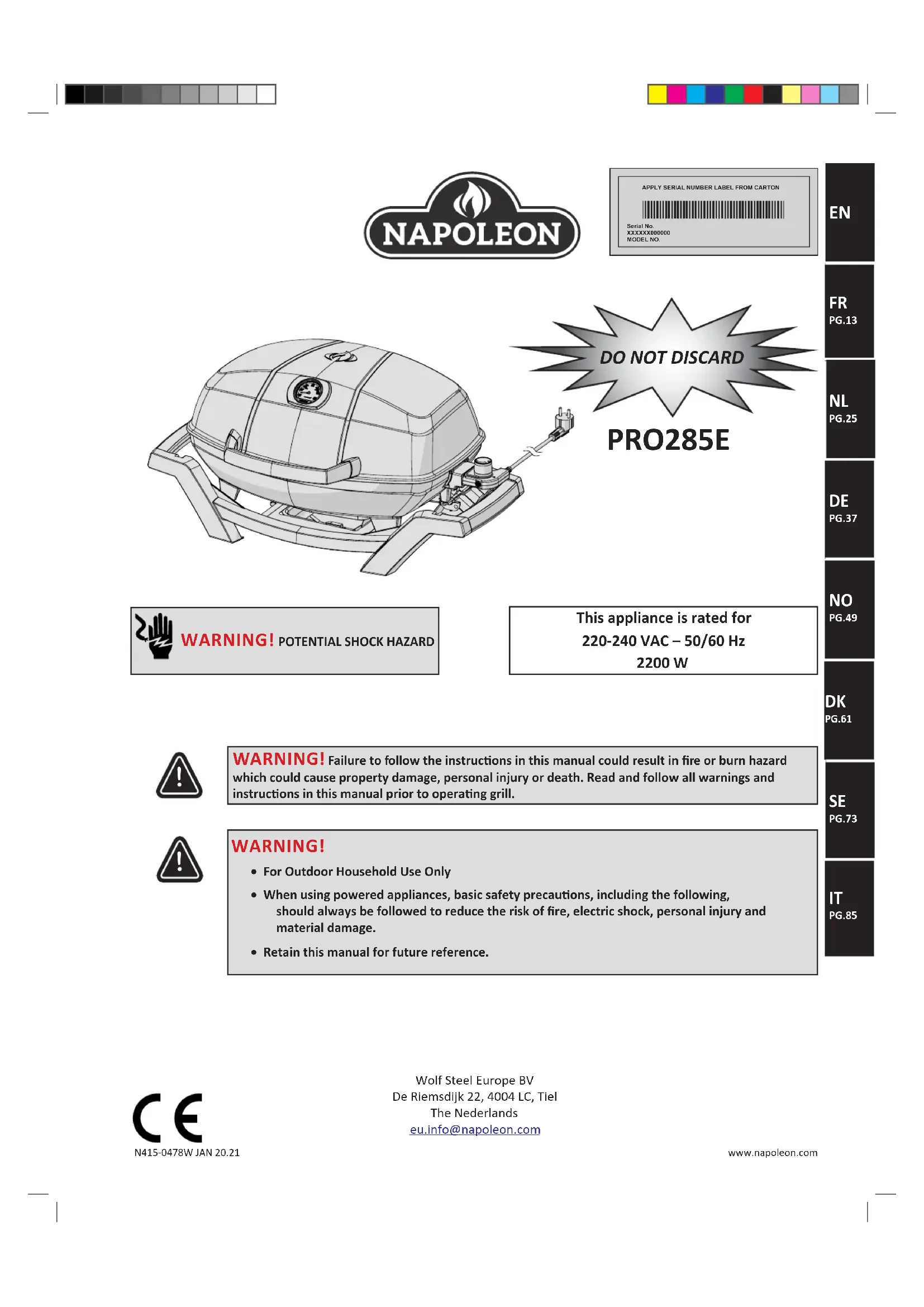 This appliance is rated for 220-240 VAC – 50/60 Hz 2200 W PRO285E WARNING! Failure to follow the instrucons in this manual could result in re or burn hazard which could cause property damage, personal injury or death. Read and follow all warnings and instrucons in this manual prior to operang grill. WARNING!