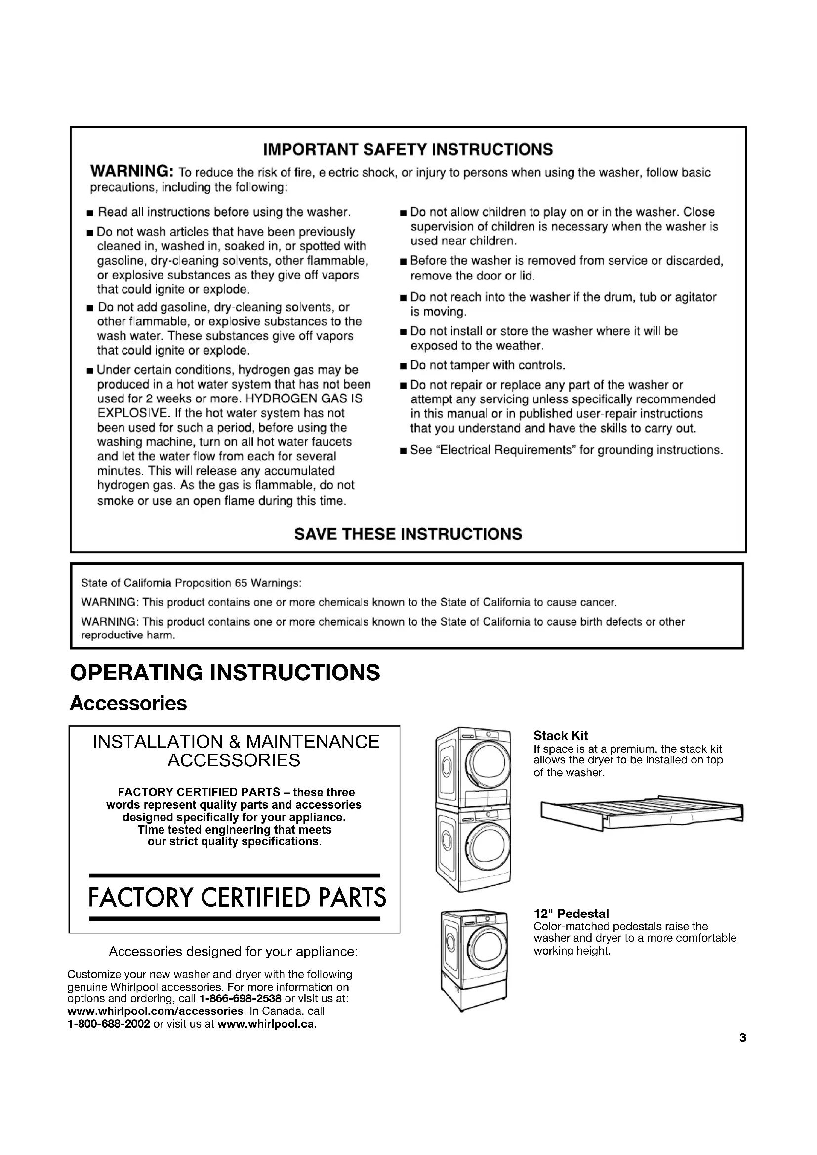 DÉPANNAGE .........................................................................59 GARANTIE .............................................................................70 ASSISTANCE OU SERVICE ...................... Couverture arrière WASHER SAFETY3 Customize your new washer and dryer with the following genuine Whirlpool accessories. For more information on options and ordering, call 1-866-698-2538 or visit us at: www.whirlpool.com/accessories. In Canada, call 1-800-688-2002 or visit us at www.whirlpool.ca. INSTALLATION & MAINTENANCE ACCESSORIES FACTORY CERTIFIED PARTS – these three words represent quality parts and accessories designed specically for your appliance. Time tested engineering that meets our strict quality specications.