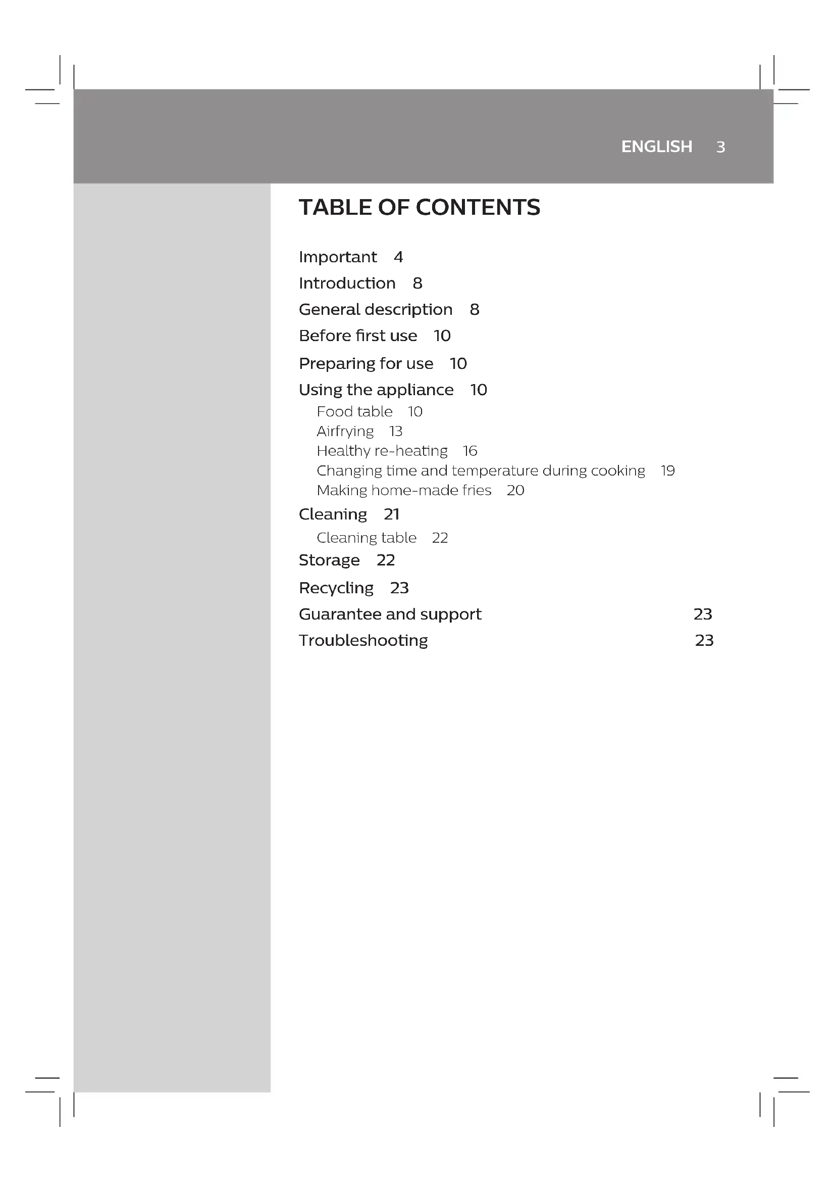 Important 4 Introduction 8 General description 8 Before rst use 10 Preparing for use 10 Using the appliance 10 Food table 10 Airfrying 13 Healthy re-heating 16 Changing time and temperature during cooking 19 Making home-made fries 20 Cleaning 21 Cleaning table 22 Storage 22 Recycling 23 Guarantee and support 23 Troubleshooting 234 ENGLISH Important Read this important information carefully before you use the appliance and save it for future reference. Danger - Always put the ingredients to be fried in the basket, to prevent them from coming into contact with the heating elements. - Do not cover the air inlet and the air outlet openings while the appliance is operating. - Do not ll the pan with oil as this may cause a re hazard. - Never immerse the appliance in water or any other liquid, nor rinse it under the tap. - Do not let any water or other liquid enter the appliance to prevent electric shock. - Never put any amount of food that exceeds the maximum level indicated in the basket. - Never touch the inside of the appliance while it is operating. Warning - Check if the voltage indicated on the appliance corresponds to the local mains voltage before you connect the appliance. - Do not use the appliance if the plug, the mains cord or the appliance itself is damaged. - If the mains cord is damaged, you must have it replaced by Philips, a service centre authorised by Philips or similarly qualied persons in order to avoid a hazard. - This appliance can be used by children aged from 8 years and above and persons with reduced physical, sensory or mental capabilities or lack of experience and knowledge if they have been given5 ENGLISH supervision or instruction concerning use of the appliance in a safe way and understand the hazards involved. Children shall not play with the appliance. Cleaning and user maintenance shall not be made by children unless they are older than 8 years and supervised. - Keep the appliance and its cord out of reach of children less than 8 years. - Keep the mains cord away from hot surfaces. - Only connect the appliance to an earthed wall socket. Always make sure that the plug is inserted into the wall socket properly. - This appliance is not intended to be operated by means of an external timer or a separate remote-control system. - Do not place the appliance against a wall or against other appliances. Leave at least 10 cm free space on the back and sides and 10 cm free space above the appliance. Do not place anything on top of the appliance. - Do not use the appliance for any other purpose than described in the user manual. - During hot air frying, hot steam is released through the air outlet openings. Keep your hands and face at a safe distance from the steam and from the air outlet openings. Also be careful of hot steam and air when you remove the pan from the appliance. - The accessible surfaces may become hot during use.6 ENGLISH - The pan, the basket and accessories inside the Airfryer become hot during use. Be careful when you handle them. - Do not place the appliance on or near a hot gas stove or all kinds of electric stove and electric cooking plates, or in a heated oven. - Never use light ingredients or baking paper in the appliance. - Do not place the appliance on or near combustible materials such as a tablecloth or curtain. - Do not let the appliance operate unattended. - Immediately unplug the appliance if you see dark smoke coming out of the appliance. Wait for the smoke emission to stop before you pull the pan out of the appliance. - Storage of potatoes: The temperature shall be appropriate to the potato variety stored and it shall be above 6°C to minimize the risk of acrylamide exposure in the prepared foodstu. - Do not plug in the appliance or operate the control panel with wet hands. Caution - This appliance is intended for normal household use only. It is not intended for use in environments such as sta kitchens of shops, oces, farms or other work environments. Nor is it intended to be used by clients in hotels, motels, bed and breakfasts and other residential environments.7 ENGLISH - Always return the appliance to a service centre authorised by Philips for examination or repair. Do not attempt to repair the appliance yourself, otherwise the guarantee becomes invalid. - If the appliance is used improperly or for professional or semi-professional purposes or if it is not used according to the instructions in the user manual, the guarantee becomes invalid and Philips refuses any liability for damage caused. - Always place and use the appliance on a dry, stable, level and horizontal surface. - Always unplug the appliance after use. - Let the appliance cool down for approx. 30 minutes before you handle or clean it. - Make sure the ingredients prepared in this appliance come out golden-yellow instead of dark or brown. Remove burnt remnants. Do not fry fresh potatoes at a temperature above 180°C (to minimise the production of acrylamide). - Be careful when cleaning the upper area of the cooking chamber: Hot heating element, edge of Metal parts. Electromagnetic elds (EMF) This Philips appliance complies with all applicable standards and regulations regarding electromagnetic elds. Automatic shut-o This appliance is equipped with an automatic shut-o function. If you do not press a button within 30 minutes, the appliance switches o automatically. To switch o the appliance manually, press the power On/o button.8 ENGLISH Introduction Congratulations on your purchase and welcome to Philips! To fully benet from the support that Philips oers, register your product at www.philips.com/welcome. Philips Airfryer is the only Airfryer with unique Rapid Air technology to fry your favorite foods with little or no added oil and up to 90% less fat. Enjoy crispier results with Philips Rapid Air for 7x faster airow. It cooks food all around as well as our starsh design for perfect results from your rst bite to your last. You can now enjoy perfectly cooked fried food—crisp