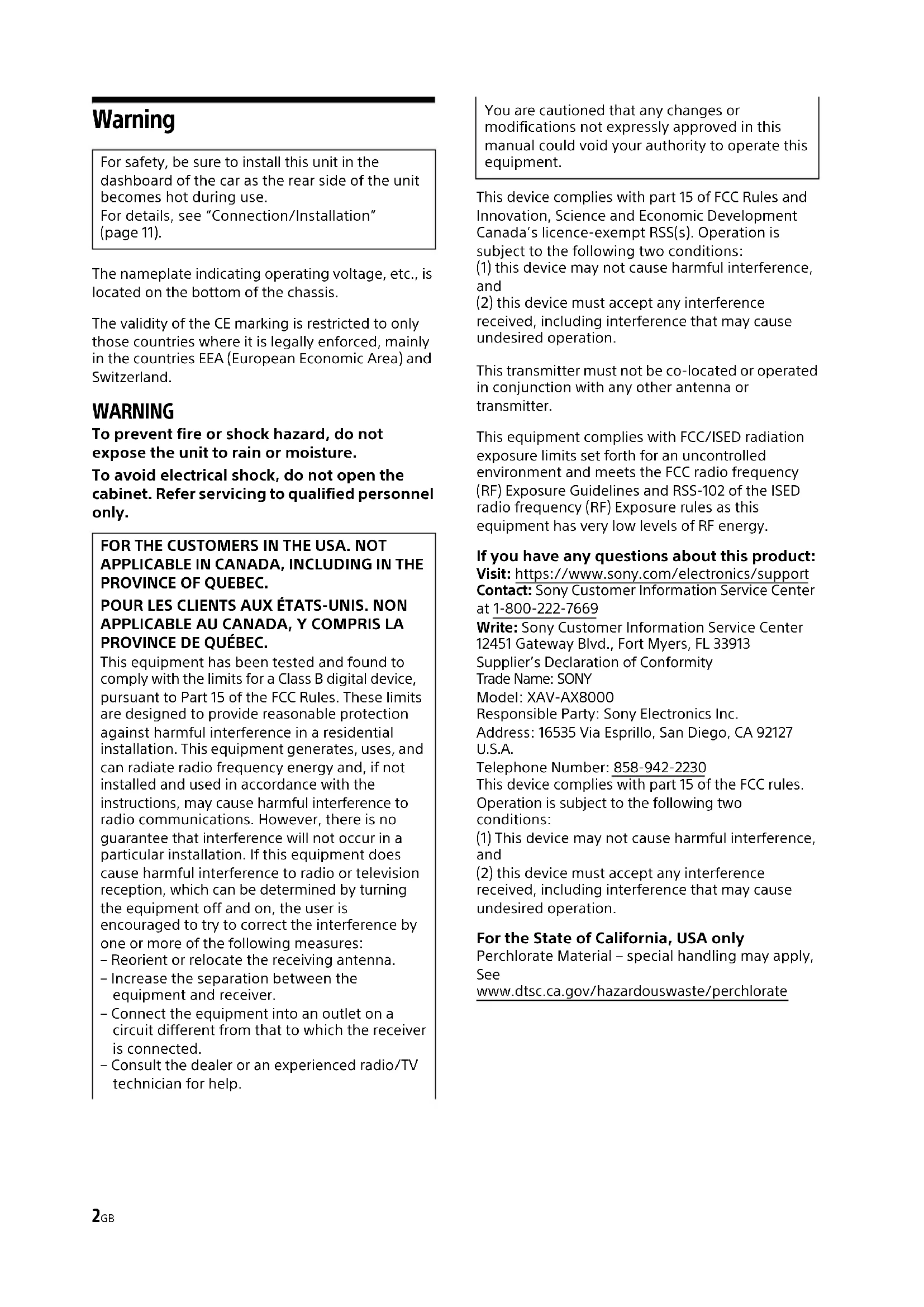 To cancel the demonstration (Demo) display, see page 7.For the connection/installation, see page 11.Pour annuler l’affichage de démonstration (Démo), reportez-vous à la page 7.Pour le raccordement/l’installation, reportez-vous à la page 11.Para cancelar la pantalla de demostración (Demostración), consulte la página 7.Para la conexión/instalación, consulte la página 12.2GB Warning The nameplate indicating operating voltage, etc., is located on the bottom of the chassis. The validity of the CE marking is restricted to only those countries where it is legally enforced, mainly in the countries EEA (European Economic Area) and Switzerland. WARNING To prevent fire or shock hazard, do not expose the unit to rain or moisture. To avoid electrical shock, do not open the cabinet. Refer servicing to qualified personnel only. This device complies with part 15 of FCC Rules and Innovation, Science and Economic Development Canada’s licence-exempt RSS(s). Operation is subject to the following two conditions: (1) this device may not cause harmful interference, and (2) this device must accept any interference received, including interference that may cause undesired operation. This transmitter must not be co-located or operated in conjunction with any other antenna or transmitter. This equipment complies with FCC/ISED radiation exposure limits set forth for an uncontrolled environment and meets the FCC radio frequency (RF) Exposure Guidelines and RSS-102 of the ISED radio frequency (RF) Exposure rules as this equipment has very low levels of RF energy. If you have any questions about this product: Visit: https://www.sony.com/electronics/support Contact: Sony Customer Information Service Center at 1-800-222-7669 Write: Sony Customer Information Service Center 12451 Gateway Blvd., Fort Myers, FL 33913 Supplier’s Declaration of Conformity Trade Name: SONY Model: XAV-AX8000 Responsible Party: Sony Electronics Inc. Address: 16535 Via Esprillo, San Diego, CA 92127 U.S.A. Telephone Number: 858-942-2230 This device complies with part 15 of the FCC rules. Operation is subject to the following two conditions: (1) This device may not cause harmful interference, and (2) this device must accept any interference received, including interference that may cause undesired operation. For the State of California, USA only Perchlorate Material – special handling may apply, See www.dtsc.ca.gov/hazardouswaste/perchlorate For safety, be sure to install this unit in the dashboard of the car as the rear side of the unit becomes hot during use. For details, see “Connection/Installation” (page 11). FOR THE CUSTOMERS IN THE USA. NOT