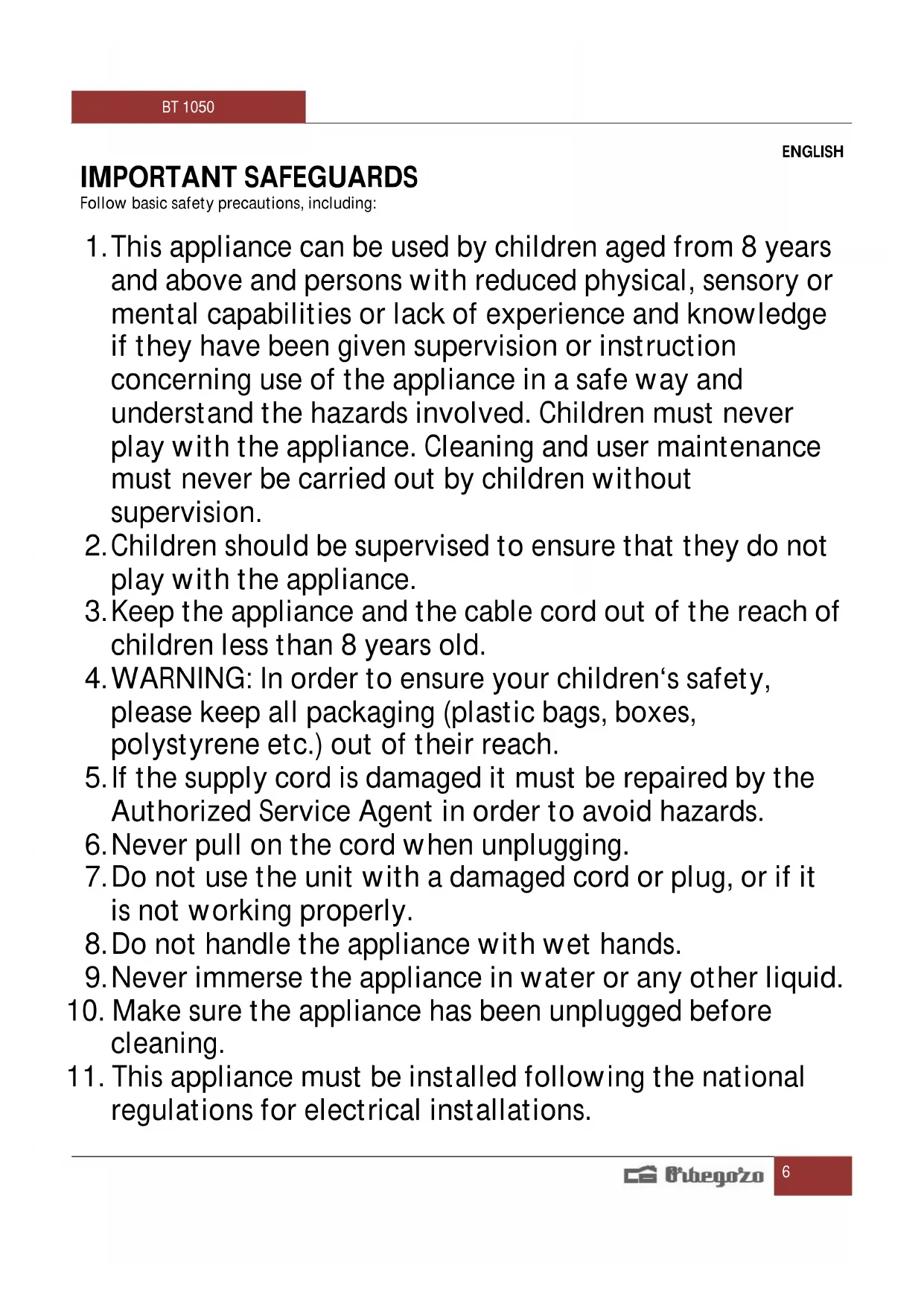 Find the device manual for free BT 1050 Orbegozo in PDF.