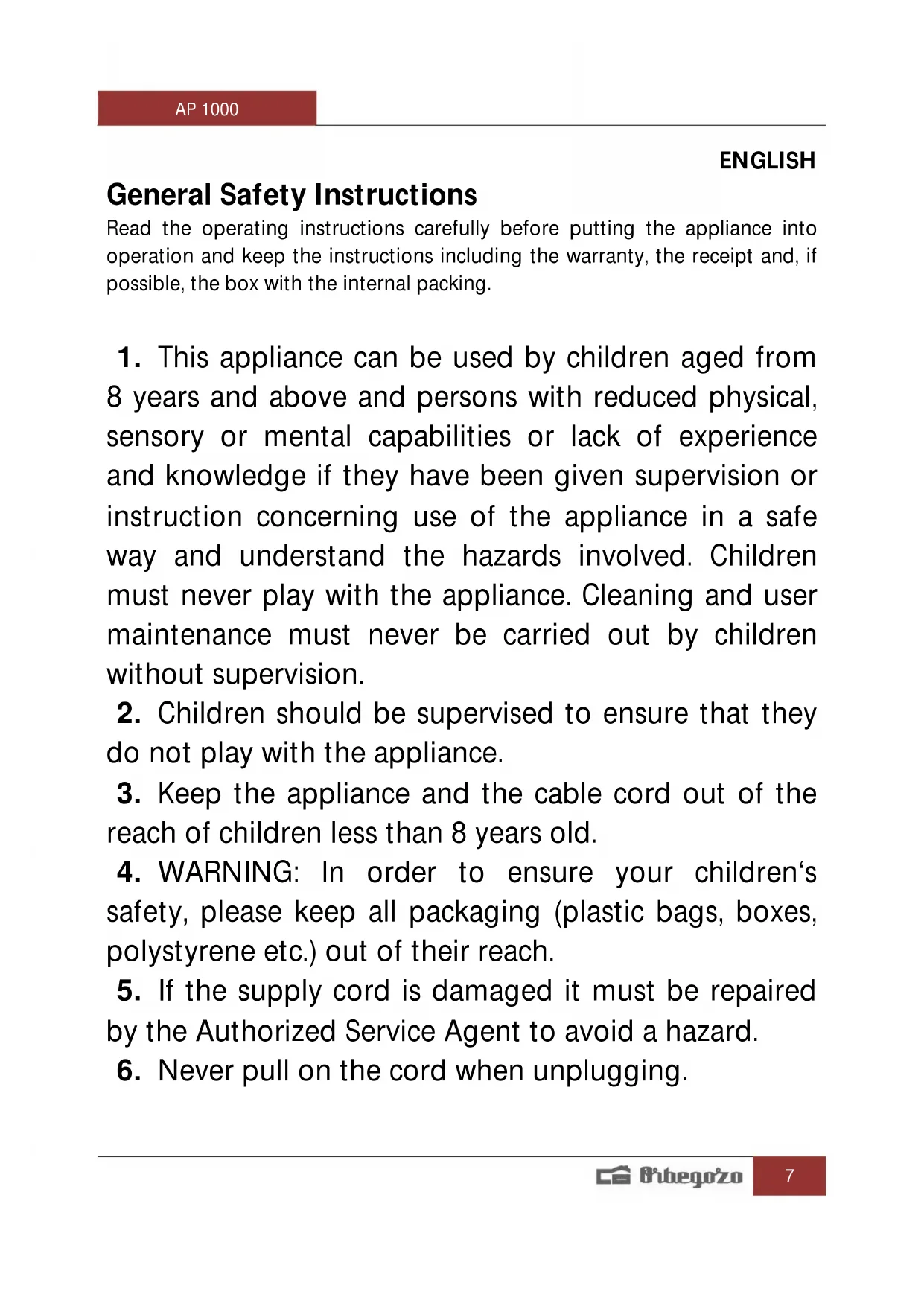 Find the device manual for free AP 1000 Orbegozo in PDF.