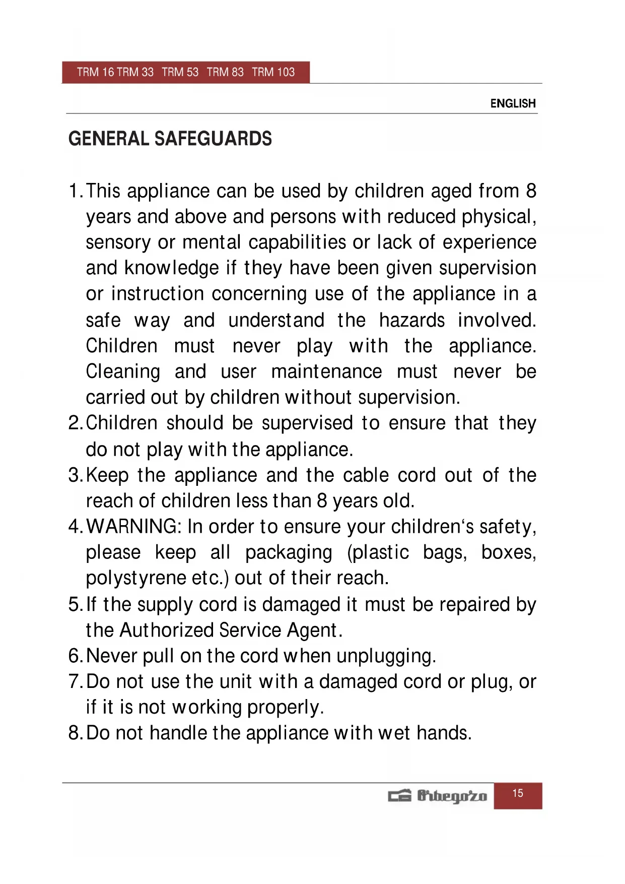 Hire the profesional mender to check and mend it. Disposal of old electrical appliances. The European directive 2002/96/EC on Waste Electrical and Electronic Equipment (WEEE), requires that old household electrical appliances must not be disposed of in the normal unsorted municipal waste stream. Old appliances must be collected separately in order to optimize the recovery and recycling of the materials they contain, and reduce the impact on human health and the environment. The crossed out “wheeled bin” symbol on the product reminds you of your obligation, that when you dispose of the appliance, it must be separately collected. Consumers should contact their local authority or retailer for information concerning the correct disposal of their old appliance. DECLARATION OF CONFORMITY: This device complies with the requirements of the Low Voltage Directive 2006/95/EC and the requirements of the EMC directive 2004/108/EC.TRM 16 TRM 33 TRM 53 TRM 83 TRM 103