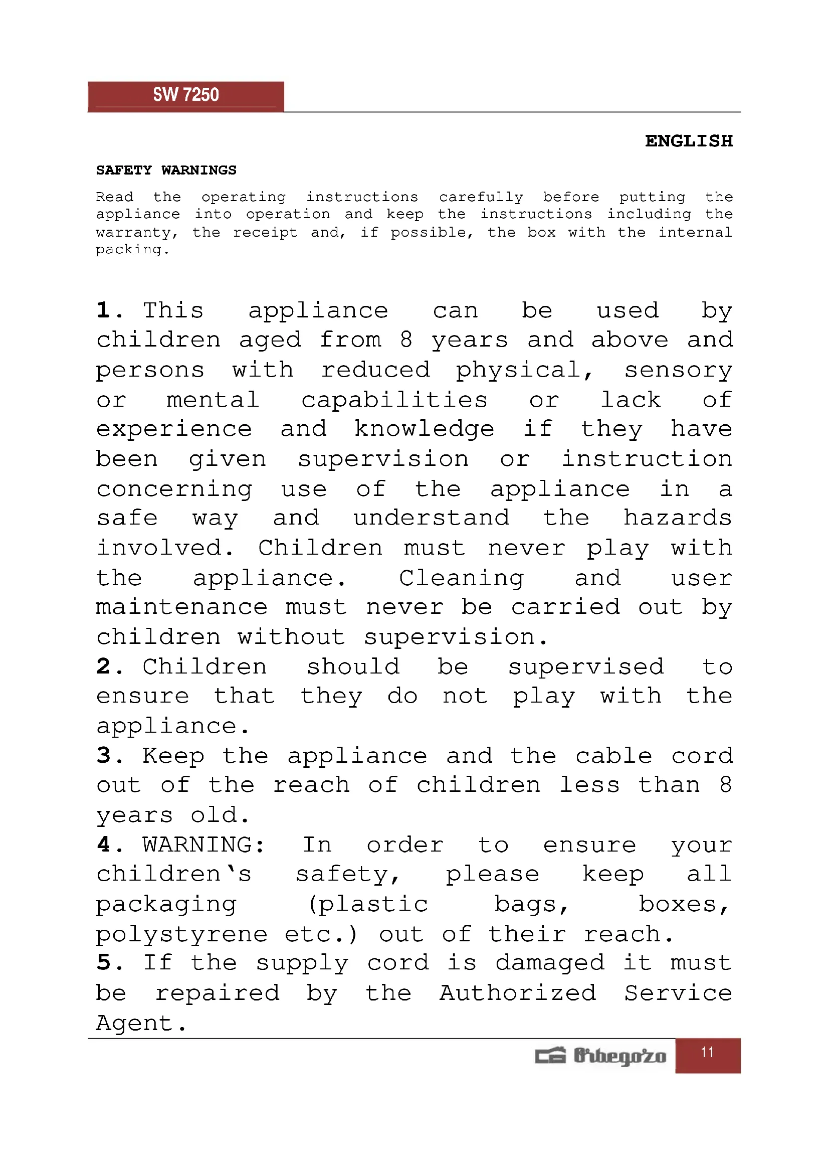 Find the device manual for free SW 7250 Orbegozo in PDF.