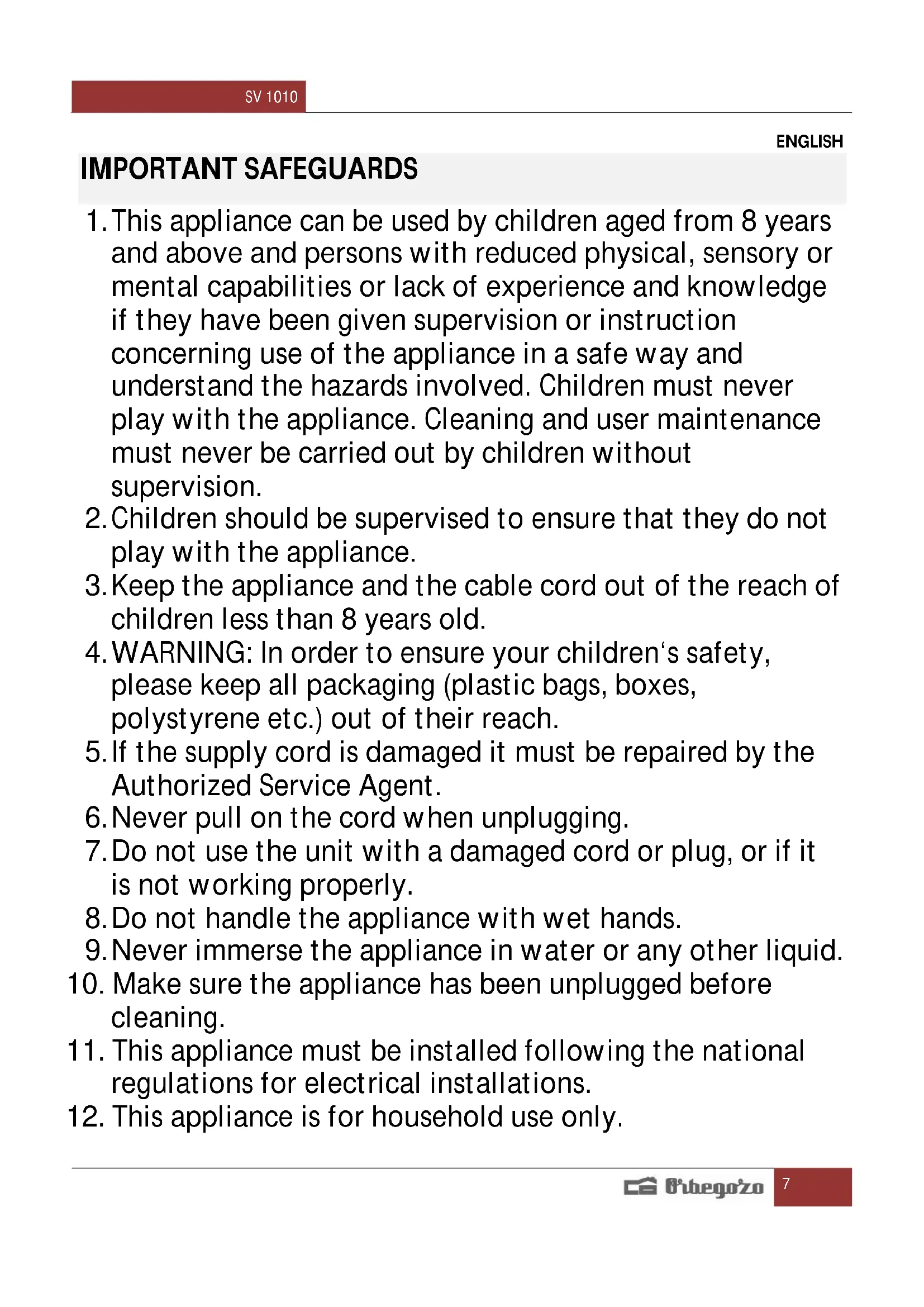 12. This appliance is for household use only.SV 1010