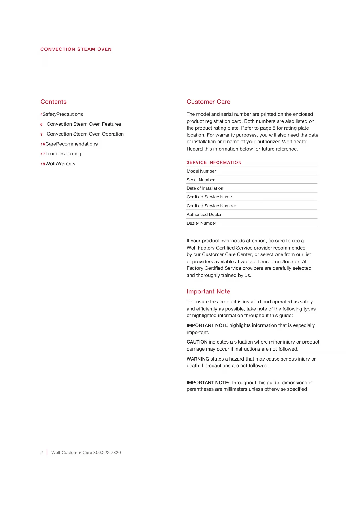 Customer Care The model and serial number are printed on the enclosed product registration card. Both numbers are also listed on the product rating plate. Refer to page 5 for rating plate location. For warranty purposes, you will also need the date of installation and name of your authorized Wolf dealer. Record this information below for future reference. SERVICE INFORMATION Model Number Serial Number Date of Installation Certied Service Name Certied Service Number Authorized Dealer Dealer Number If your product ever needs attention, be sure to use a Wolf Factory Certied Service provider recommended by our Customer Care Center, or select one from our list of providers available at wolfappliance.com/locator. All Factory Certied Service providers are carefully selected and thoroughly trained by us. Important Note To ensure this product is installed and operated as safely and efciently as possible, take note of the following types of highlighted information throughout this guide: IMPORTANT NOTE highlights information that is especially important. CAUTION indicates a situation where minor injury or product damage may occur if instructions are not followed. WARNING states a hazard that may cause serious injury or death if precautions are not followed. IMPORTANT NOTE: Throughout this guide, dimensions in parentheses are millimeters unless otherwise specied. Contents 4 Safety Precautions6 Convection Steam Oven Features7 Convection Steam Oven Operation16 Care Recommendations17 Troubleshooting19 Wolf Warrantywolfappliance.com