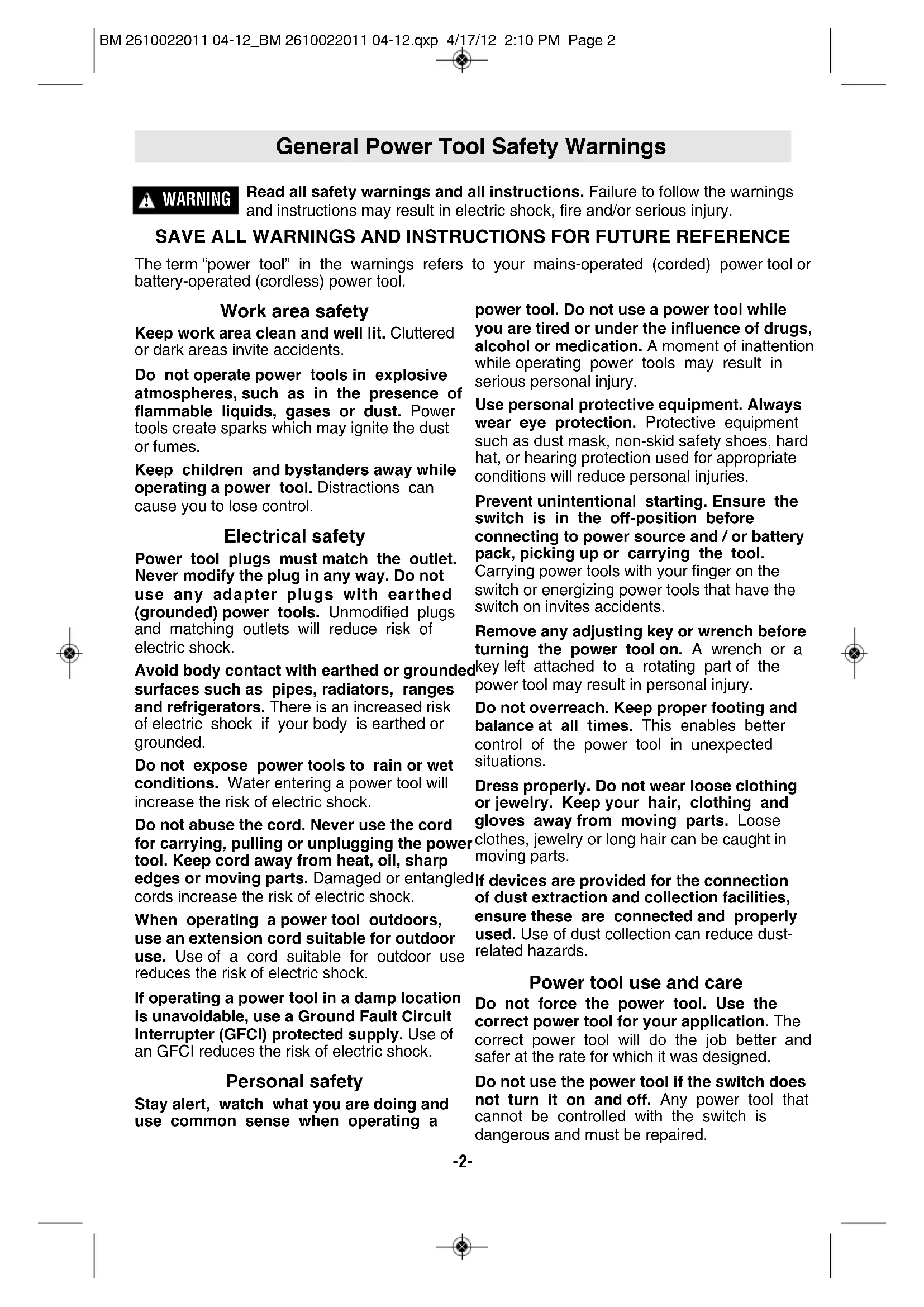 WARNING General Power Tool Safety Warnings BM 2610022011 04-12_BM 2610022011 04-12.qxp 4/17/12 2:10 PM Page 2Disconnect the plug from the power source and/or the battery pack from the power tool before making any adjustments, changing