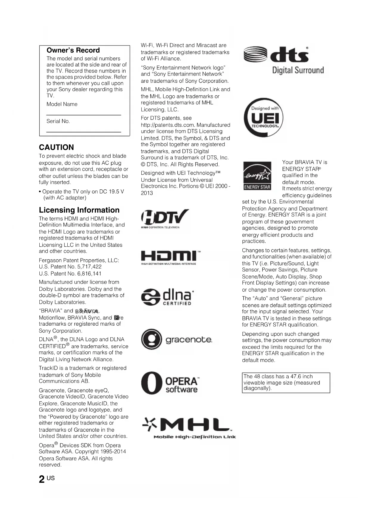 Devices SDK from Opera Software ASA. Copyright 1995-2014 Opera Software ASA. All rights reserved. Wi-Fi, Wi-Fi Direct and Miracast are trademarks or registered trademarks of Wi-Fi Alliance. “Sony Entertainment Network logo” and “Sony Entertainment Network” are trademarks of Sony Corporation. MHL, Mobile High-Definition Link and the MHL Logo are trademarks or registered trademarks of MHL Licensing, LLC. For DTS patents, see http://patents.dts.com. Manufactured under license from DTS Licensing Limited. DTS, the Symbol, & DTS and the Symbol together are registered trademarks, and DTS Digital Surround is a trademark of DTS, Inc. © DTS, Inc. All Rights Reserved. Designed with UEI Technology™ Under License from Universal Electronics Inc. Portions © UEI 2000 -