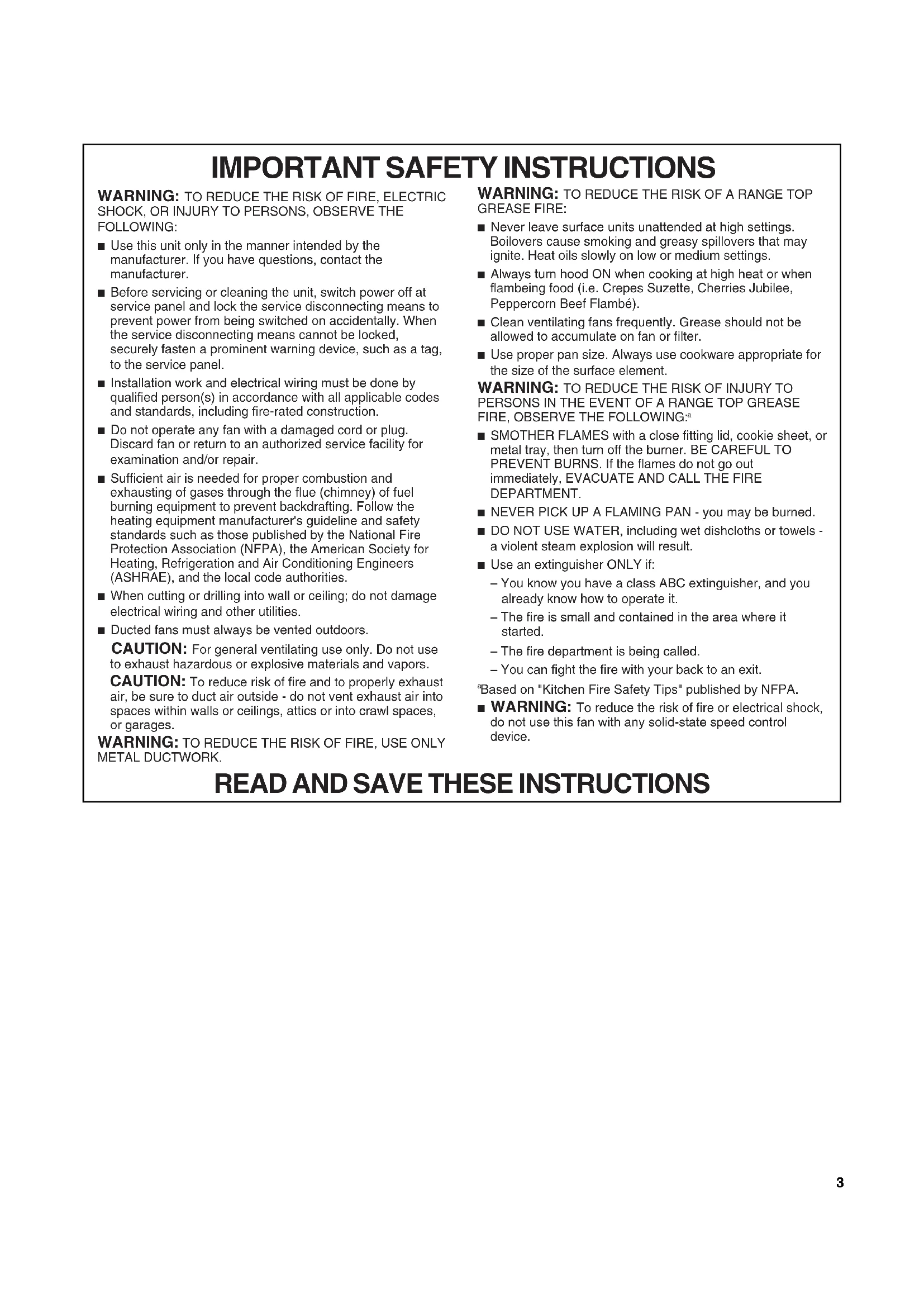 GREASE FIRE: ■ Never leave surface units unattended at high settings. Boilovers cause smoking and greasy spillovers that may ignite. Heat oils slowly on low or medium settings. ■ Always turn hood ON when cooking at high heat or when flambeing food (i.e. Crepes Suzette, Cherries Jubilee, Peppercorn Beef Flambé). ■ Clean ventilating fans frequently. Grease should not be allowed to accumulate on fan or filter. ■ Use proper pan size. Always use cookware appropriate for the size of the surface element.