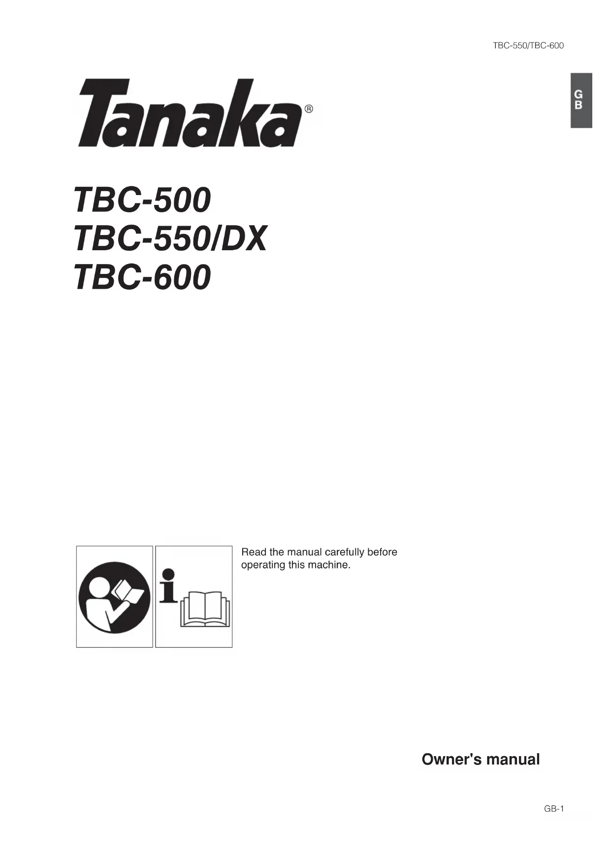 3TBC-550/TBC-600 GB-6 Always wear a safety face shield or goggles. Always wear heavy, long pants, boots and gloves. Do not wear loose clothing, jewelry, short pants, sandals or go barefoot. Secure hair so it is above shoulder length. Do not operate this tool when you are tired, ill or under the influence of alcohol, drugs or medication. Never let a child or inexperienced person operate the machine. Wear hearing protection. Never start or run the engine inside a closed room or building. Breathing exhaust fumes can kill. Keep handles free of oil and fuel. Keep hands away from cutting equipment. Do not grab or hold the unit by the cutting equipment. When the unit is turned off, make sure the cutting attachment has stopped before the unit is set down. When operation is prolonged, take a break from time to time so that you may avoid possible whitefinger disease which is caused by vibration. Inspect the entire unit/machine before each use. Replace damaged parts. Check for fuel leaks and make sure all fasteners are in place and securely tightened. Replace parts that are cracked, chipped or damaged in any way before using the unit/machine. Make sure the safety guard is properly attached. Keep others away when making carburetor adjustments. Use only accessories as recommended for this unit/machine by the manufacturer. Move at least 3 m away from fueling site before starting engine. Stop engine before removing fuel cap. Empty the fuel tank before storing the unit/machine. It is recommended that the fuel be emptied after each use. If fuel is left in the tank, store so fuel will not leak. Store unit/machine and fuel in area where fuel vapors cannot reach sparks or open flames from water heaters, electric motors or switches, furnaces. etc. Mix and pour fuel outdoors and where there are no sparks or flames. Use a container approved for fuel. Do not smoke or allow smoking near fuel or the unit/machine or while using the unit/machine. Wipe up all fuel spills before starting engine. Fuel safety Unit / machine safety Do not cut any material other than grass and brush. Inspect the area to be cut before each use. Remove objects which can be thrown or become entangled. For respiratory protection, wear an aerosol protection mask when cutting the grass after insecticide is scattered. Keep others including children, animals, bystanders and helpers outside the 15 m hazard zone. Stop the engine immediately if you are approached. Always keep the engine on the right side of your body. Hold the unit/machine firmly with both hands. Keep firm footing and balance. Do not over-reach. Keep all parts of your body away from the muffler and cutting attachment when the engine is running. Keep cutting attachment below waist level. Cutting safety Maintain the unit/machine according to recommended procedures. Disconnect the spark plug before performing maintenance except for carburetor adjustments. Keep others away when making carburetor adjustments. Use only genuine Tanaka replacement parts as recommended by the manufacturer. Maintenance safety