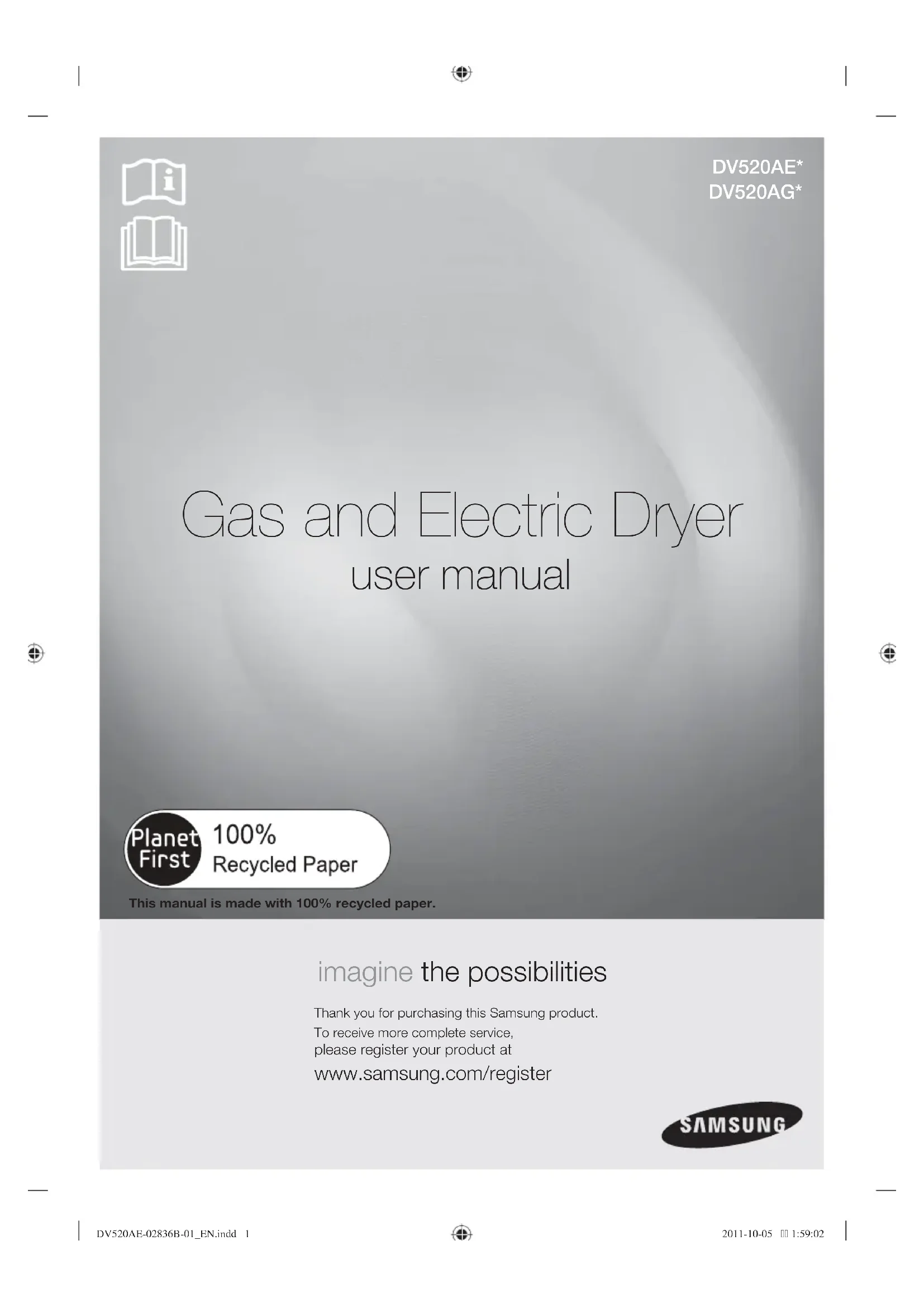 Gas and Electric Dryer user manual imagine the possibilities Thank you for purchasing this Samsung product.To receive more complete service, please register your product at www.samsung.com/register DV520AE* DV520AG* This manual is made with 100% recycled paper. DV520AE-02836B-01_EN.indd 1DV520AE-02836B-01_EN.indd 1 2011-10-05 1:59:022011-10-05 1:59:022_ Features features