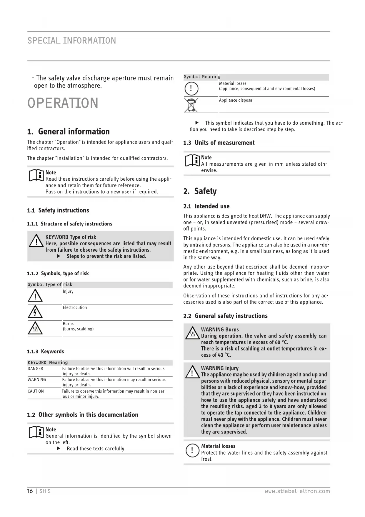 SPECIAL INFORMATION - The appliance may be used by children aged3 and up and persons with reduced physical, sen- sory or mental capabilities or a lack of experience and know-how, provided that they are supervised or they have been instructed on how to use the appliance safely and have understood the result- ing risks. aged 3 to 8 years are only allowed to operate the tap connected to the appliance. Chil- dren must never play with the appliance. Children must never clean the appliance or perform user maintenance unless they are supervised. - The connection to the power supply is only per- missible as a permanent connection in conjunc- tion with the removable cable grommet. Ensure the appliance can be separated from the power supply by an isolator that disconnects all poles with at least 3mm contact separation. - Secure the appliance as described in chapters "Installation/ Preparations" and "Installation/ In- stallation/ Appliance installation". - Observe the minimum and maximum water inlet pressure (see chapter "Installation/Specification/ Data table"). - Drain the appliance as described in the chap- ter "Installation/ Maintenance/ Draining the appliance". - Install a residual current device (RCD). Sealed unvented operating mode: - The appliance is under pressure. During the heat- up process, expansion water will drip from the safety valve. - Regularly activate the safety valve to prevent it from becoming blocked, e.g. by limescale deposits. - Install a type-tested safety valve in the cold water supply line. Please note that, depending on the static pressure, you may also need a pressure re- ducing valve. - Size the drain so that water can drain off unim- peded when the safety valve is fully opened. - Fit the discharge pipe of the safety valve with a constant downward slope and in a room free from the risk of frost.16 | SH S www.stiebel-eltron.com SPECIAL INFORMATION - The safety valve discharge aperture must remain open to the atmosphere. OPERATION