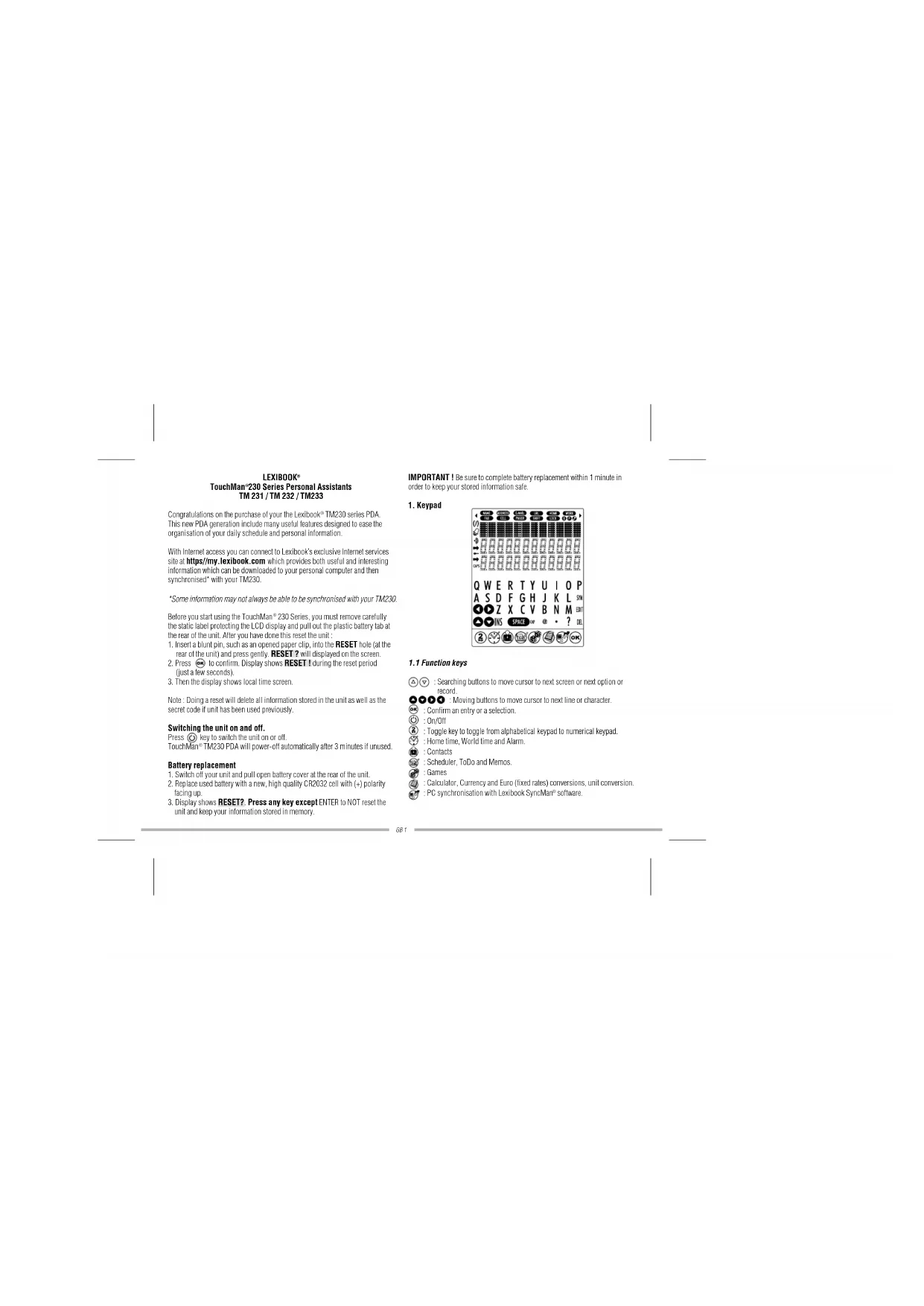 TM230 series PDA. This new PDA generation include many useful features designed to ease the organisation of your daily schedule and personal information. With Internet access you can connect to Lexibook’s exclusive Internet services site at https//my.lexibook.com which provides both useful and interesting information which can be downloaded to your personal computer and then synchronised* with your TM230. *Some information may not always be able to be synchronised with your TM230. Before you start using the TouchMan