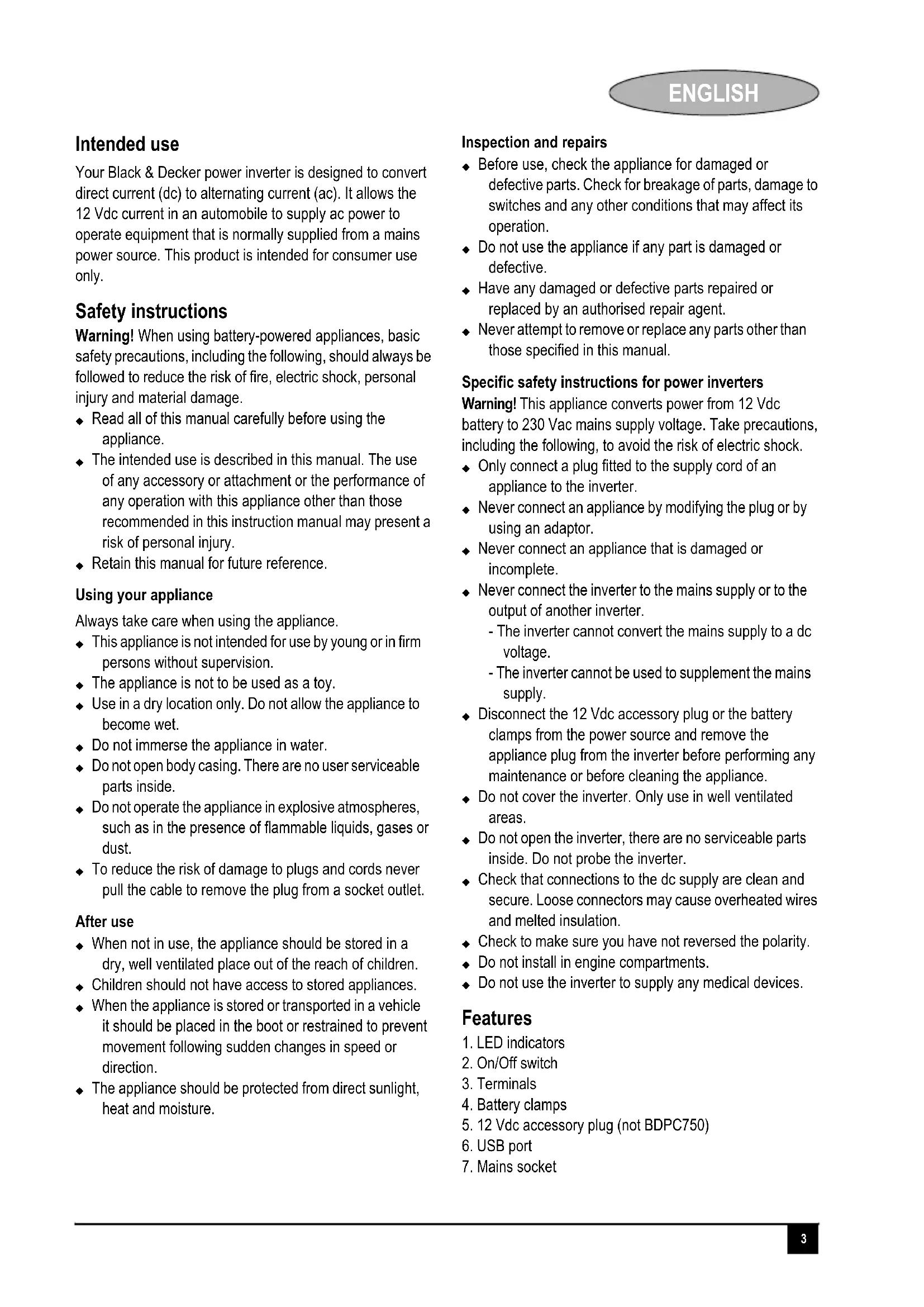 Your Black & Decker power inverter is designed to convert direct current (dc) to alternating current (ac). It allows the 12 Vdc current in an automobile to supply ac power to operate equipment that is normally supplied from a mains power source. This product is intended for consumer use only.