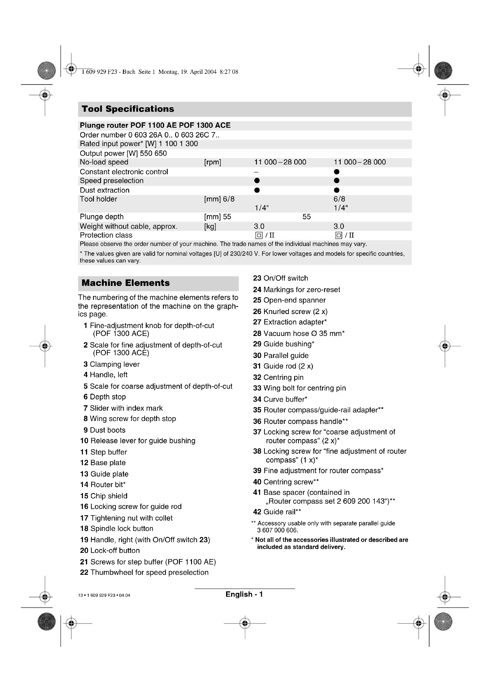 - The values given are valid for nominal voltages [U] of 230/240 V. For lower voltages and models for specific countries, these values can vary. Machine Elements 1 609 929 F23 - Buch Seite 1 Montag, 19. April 2004 8:27 08 13 • 1 609 929 F23 • 04.04English - 2 The machine is intended for routing grooves, edges, profiles and elongated holes as well as copy routing in wood, plastic and light building materials, while resting firmly on the workpiece. With reduced speed and with appropriate routing bits, non-ferrous alloys can also be machined. Working safely with this ma- chine is possible only when the operating and safety information are read completely and the in- structions contained therein are strictly followed. In addition, the general safety notes in the enclosed booklet must be observed. Before using for the first time, ask for a practical demonstration. ■ Wear protective glasses and hearing protec- tion. ■ Wear sturdy shoes. ■ For long hair, wear hair protection. Work only with closely fitting clothes. ■ If the mains cable is damaged or cut through while working, do not touch the cable but im- mediately pull the mains plug. Never use the machine with a damaged cable. ■ Connect machines that are used in the open via a residual current device (RCD) with an ac- tuating current of 30 mA maximum. Do not op- erate the machine in rain or moisture. ■ Always direct the cable to the rear away from the machine. ■ Use appropriate detectors to determine if utility lines are hidden in the work area or call the local utility company for assist- ance. Contact with electric lines can lead to fire and electric shock. Damaging a gas line can lead to explosion. Penetrating a water line causes property damage or may cause an electric shock. ■ Hold the power tool only by the insulated gripping surfaces, when performing an op- eration where the cutting tool may run into hidden wiring or its own cord. Contact with a “live” wire will make exposed metal parts of the tool “live” and shock the op- erator. ■ When working with the machine, always hold it firmly with both hands and provide for a secure stance. ■ Secure the workpiece. A workpiece clamped with clamping devices or in a vice is held more secure than by hand. ■ Apply the machine to the workpiece only when switched on. ■ Before putting into operation, check the routing tool for firm seating. ■ Never route over metal objects such as nails or screws. ■ Keep hands away from rotating router bit. ■ After finishing work, guide the machine back into the upper starting position by actuating the clamping lever and switch the machine off. ■ Always switch the machine off and wait until it has come to a standstill before placing it down. ■ Protect tools from impact and shock. ■ Never allow children to use the machine. ■ Bosch is only able to ensure perfect operation of the machine if the original accessories in- tended for it are used. Router Bit Selection Depending on processing and application, router bits are available in the most different designs and qualities: Router bits made of high speed steel (HSS) are suitable for the machining of soft materials, e. g. soft wood and plastic. Carbide tipped router bits (HM) are particularly suitable for hard and abrasive materials, e. g. hard wood and aluminium. Use only routing tools with an allowable speed matching at least the highest no- load speed of the machine. The shank diameter of the router bit must correspond with the rated diame- ter of the tool holder (collet). Original router bits from the extensive Bosch ac- cessories program are available at your specialist shop. Intended Use For Your Safety Inserting a Router Bit 1 609 929 F23 - Buch Seite 2 Montag, 19. April 2004 8:27 08 14 • 1 609 929 F23 • 04.04English - 3 Inserting Router Bits (see figure ) ■ Before any work on the machine itself, pull the mains plug. ■ It is recommended to wear protective gloves when inserting or replacing router bits. Fold down chip shield 15. Press spindle lock button 18 and keep de- pressed. If required, turn the spindle by hand until the lock engages. ■ Press the spindle lock button only when at a standstill. Insert router bit. The shank of the router bit must be inserted at least 20 mm (shank length). Tighten the tightening nut 17 with the open-end spanner 25 (size 19 mm). Release the spindle lock button 18. Fold up chip shield 15. Do not tighten the tightening nut of the collet without a router bit inserted. ■ The dust that is produced while working can be detrimental to health, inflammable or explo- sive. Suitable safety measures are required. Examples: Some dusts are regarded as carci- nogenic. Use suitable dust/chip extraction and wear a dust respirator. ■ Dust from light alloys can burn or explode. Al- ways keep the workplace clean, as blends of materials are particularly dangerous. Mounting the Extraction Adapter (see figure ) Press the chip shield 15 together at the holding fixture on the base plate and remove it. Fasten dust-collection adapter 27 to base plate 12 with both knurled screws 26 and connect vac via suction hose 28 (accessory).