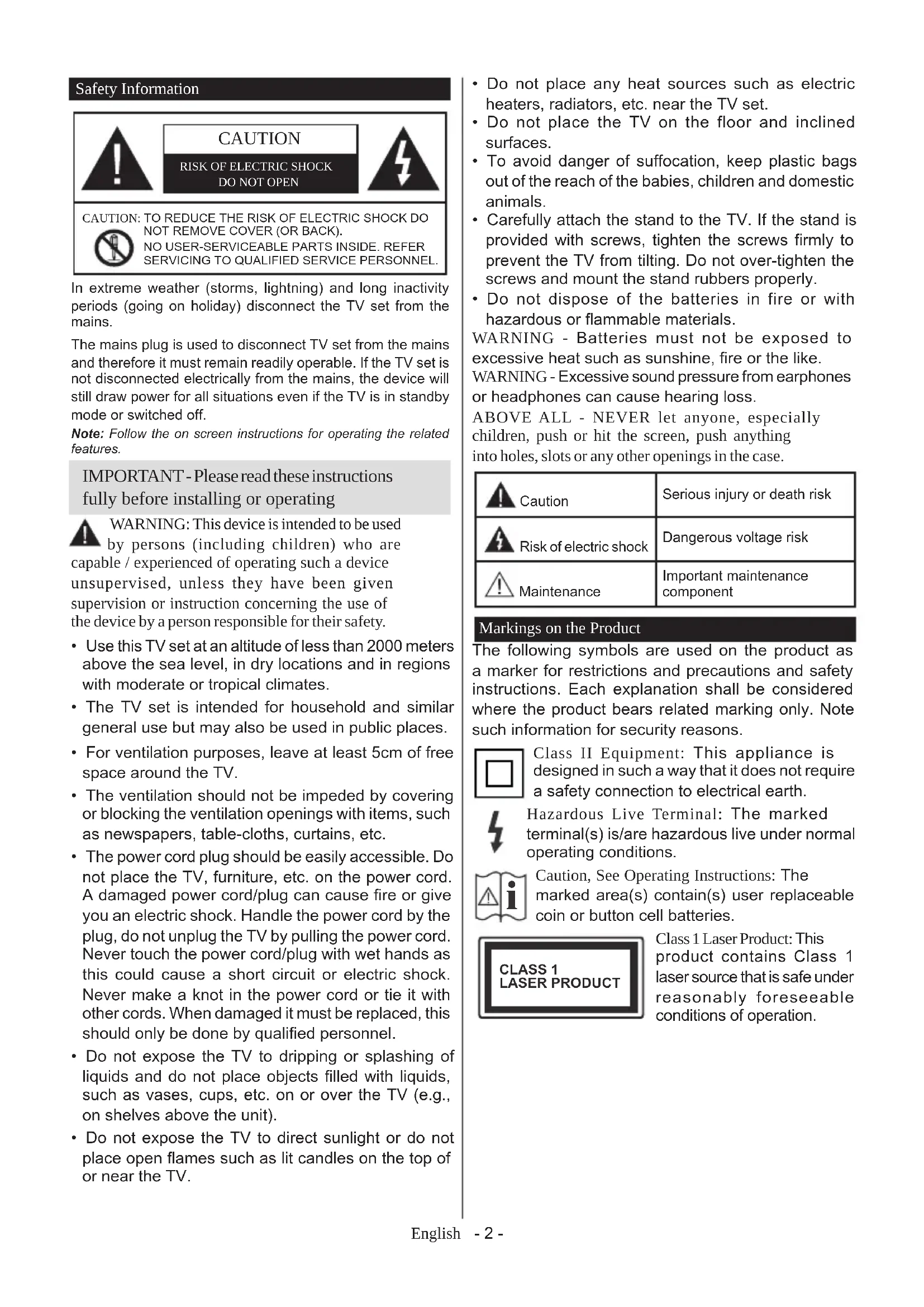 Caution, See Operating Instructions: The marked area(s) contain(s) user replaceable coin or button cell batteries. CLASS 1 LASER PRODUCT Class 1 Laser Product: This product contains Class 1 laser source that is safe under reasonably foreseeable conditions of operation.English - 3 - WARNING Do not ingest the battery, Chemical Burn Hazard This product or the accessories supplied with the product may contain a coin/button cell battery. If the coin/button cell battery is swallowed, it can cause severe internal burns in just 2 hours and can lead to death. Keep new and used batteries away from children. If the battery compartment does not close securely, stop using the product and keep it away from children. If you think batteries might have been swallowed or placed inside any part of the body, seek immediate medical attention. – – – – – – – – – – – – Warning Stability Hazard A television may fall, causing serious personal injury or death. Many injuries, particuIarly to children, can be avoided by taking simple precautions such as: