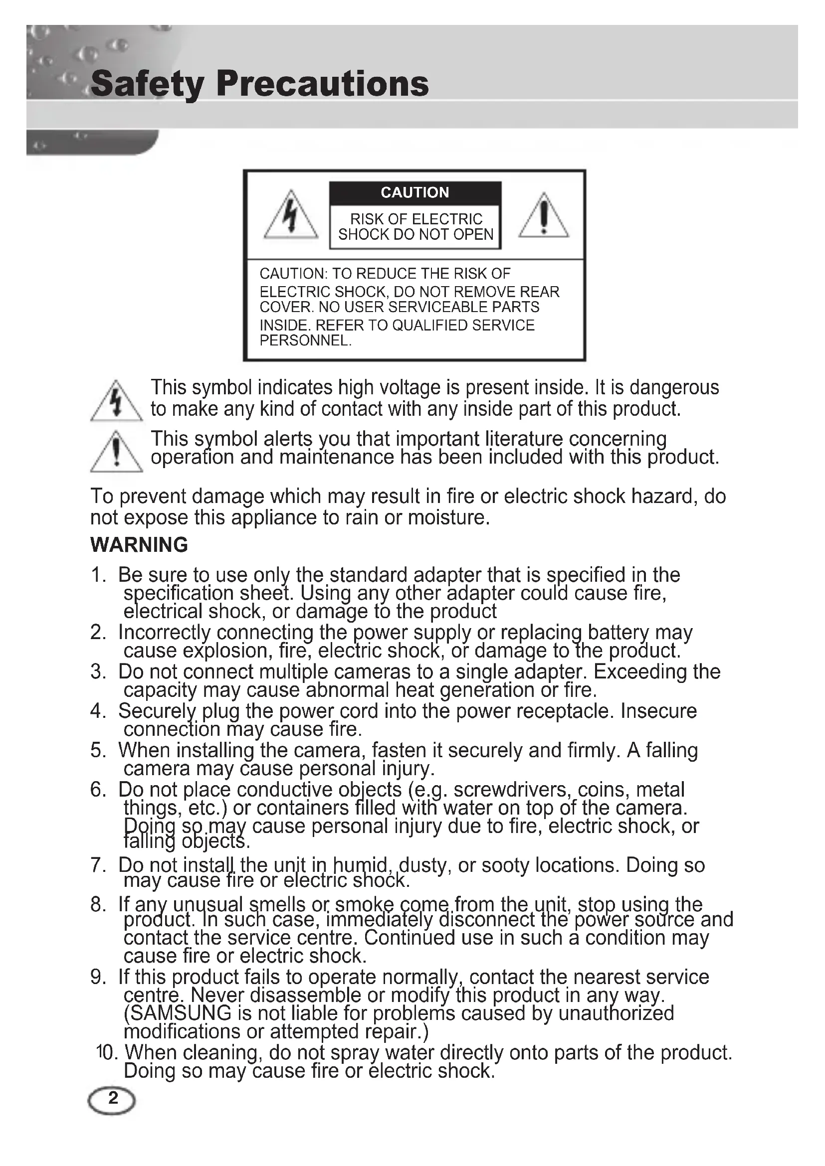 things, etc.) or containers filled with water on top of the camera. Doing so may cause personal injury due to fire, electric shock, or falling objects.