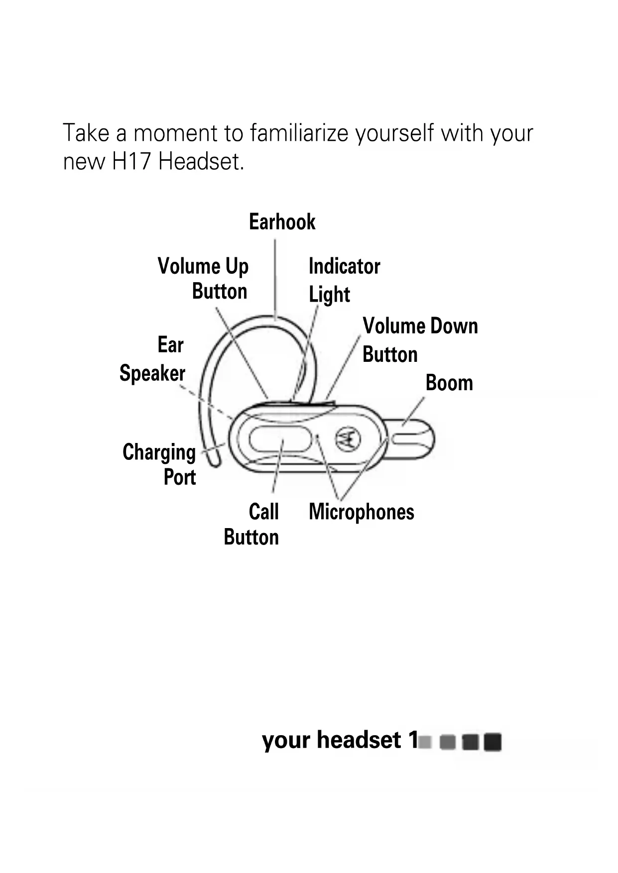 Quick Start Guide motorola H17your headset 1 your hea dset Take a moment to familiarize yourself with your new H17 Headset. Boom Charging Port Volume Down Button Call Button Ear Speaker Indicator Light Microphones Volume Up Button Earhookcharge it2 charge i t You’ll need to charge your headset before using it. Close the boom and plug the charger into the charging port on your headset and a wall outlet. The indicator light is red or yellow while the battery is charging. When the battery is fully charged, the indicator light turns green. Note: Headset is not functional while charging. Note: Your battery is designed to last the life of your product. It should only be removed by a recycling facility. Any attempt to remove or replace your battery will damage your headset.pair & connect 3 pair & connect Let’s get your headset paired and connected to your Bluetooth phone(s). pair & connect first phone