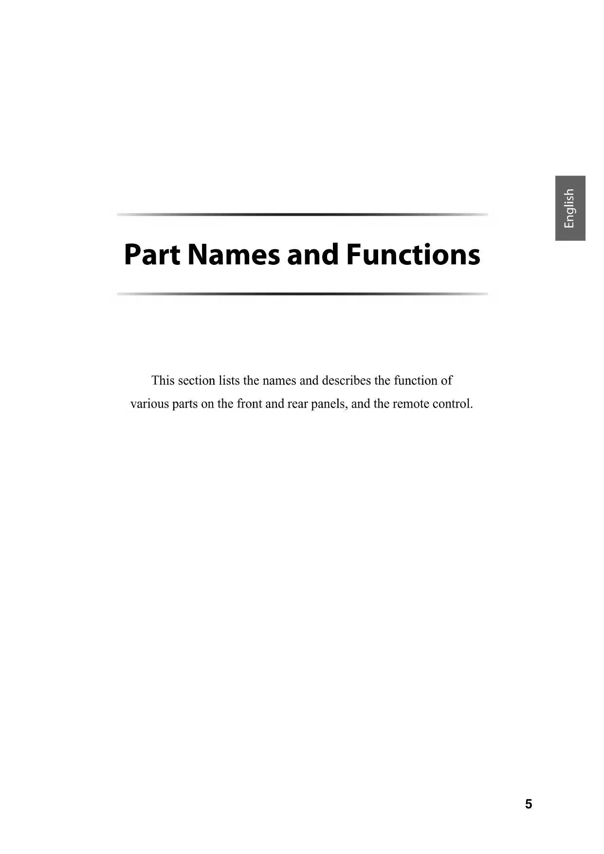 Part Names and Functions This section lists the names and describes the function of various parts on the front and rear panels, and the remote control.6 Part Names and Functions Front panel 1 A (Power) switch/indicator While the A (Power) switch is in the up position, press the A AMP key on the remote control repeatedly to switch the power to the unit between on and standby mode. In addition, under either of the following conditions, the unit will enter standby mode.• If the Auto Power Standby function is enabled. (➔ page 10)• If you turn off the power to a device that has been set to trigger connection to this unit. (➔ page 20)