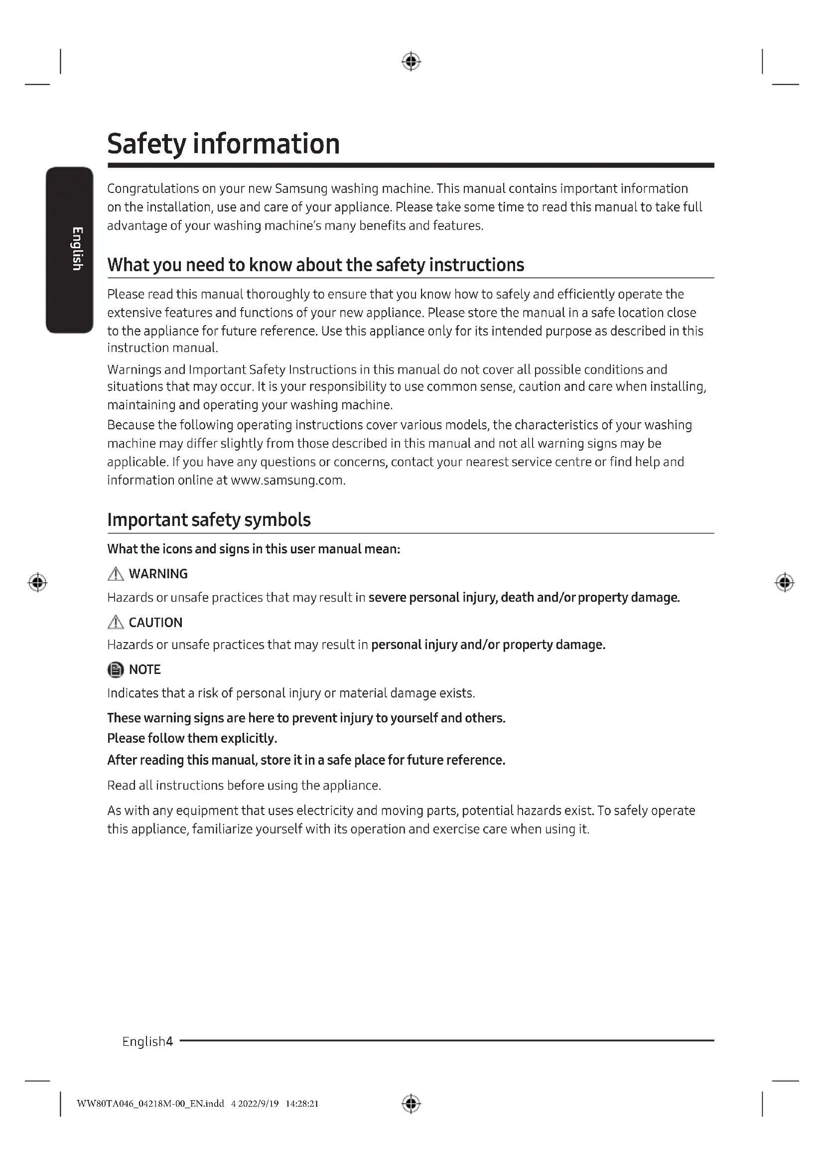 Washing Machine User manual WW8*TA*****/WW9*TA***** WW80TA046_04218M-00_EN.indd 1 2022/9/19 14:28:14Contents English English2 Contents Safety information 4 What you need to know about the safety instructions 4 Important safety symbols 4 Important safety precautions 5 Critical installation warnings 7 Installation cautions 8 Critical usage warnings 8 Usage cautions 10 Critical cleaning warnings 13 Installation 14 What’s included 14 Installation requirements 16 Step-by-step installation 18 Before you start 28 Initial settings 28 Laundry guidelines 28 Detergent drawer guidelines 32 Operations 35 Control panel 35 Simple steps to start 37 Cycle overview 38 Settings 41 Maintenance 42 Drum clean 42 Smart Check 43 Emergency drain 44 Cleaning 45 Recovery from freezing 48 Care against an extended time of disuse 48 WW80TA046_04218M-00_EN.indd 2 2022/9/19 14:28:16English 3English Troubleshooting 49 Checkpoints 49 Information codes 53 Specifications 56 Fabric care chart 56 Protecting the environment 58 Spare parts guarantee 58 Specification sheet 58 WW80TA046_04218M-00_EN.indd 3 2022/9/19 14:28:16Safety information English English4 Safety information Congratulations on your new Samsung washing machine. This manual contains important information on the installation, use and care of your appliance. Please take some time to read this manual to take full advantage of your washing machine’s many benefits and features. What you need to know about the safety instructions Please read this manual thoroughly to ensure that you know how to safely and efficiently operate the extensive features and functions of your new appliance. Please store the manual in a safe location close to the appliance for future reference. Use this appliance only for its intended purpose as described in this instruction manual. Warnings and Important Safety Instructions in this manual do not cover all possible conditions and situations that may occur. It is your responsibility to use common sense, caution and care when installing, maintaining and operating your washing machine. Because the following operating instructions cover various models, the characteristics of your washing machine may differ slightly from those described in this manual and not all warning signs may be applicable. If you have any questions or concerns, contact your nearest service centre or find help and information online at www.samsung.com. Important safety symbols What the icons and signs in this user manual mean: WARNING Hazards or unsafe practices that may result in severe personal injury, death and/or property damage. CAUTION Hazards or unsafe practices that may result in personal injury and/or property damage. NOTE Indicates that a risk of personal injury or material damage exists. These warning signs are here to prevent injury to yourself and others. Please follow them explicitly. After reading this manual, store it in a safe place for future reference. Read all instructions before using the appliance. As with any equipment that uses electricity and moving parts, potential hazards exist. To safely operate this appliance, familiarize yourself with its operation and exercise care when using it. WW80TA046_04218M-00_EN.indd 4 2022/9/19 14:28:21English 5English Important safety precautions WARNING To reduce the risk of fire, electric shock, or injury to persons when using your appliance, follow basic precautions, including the following: