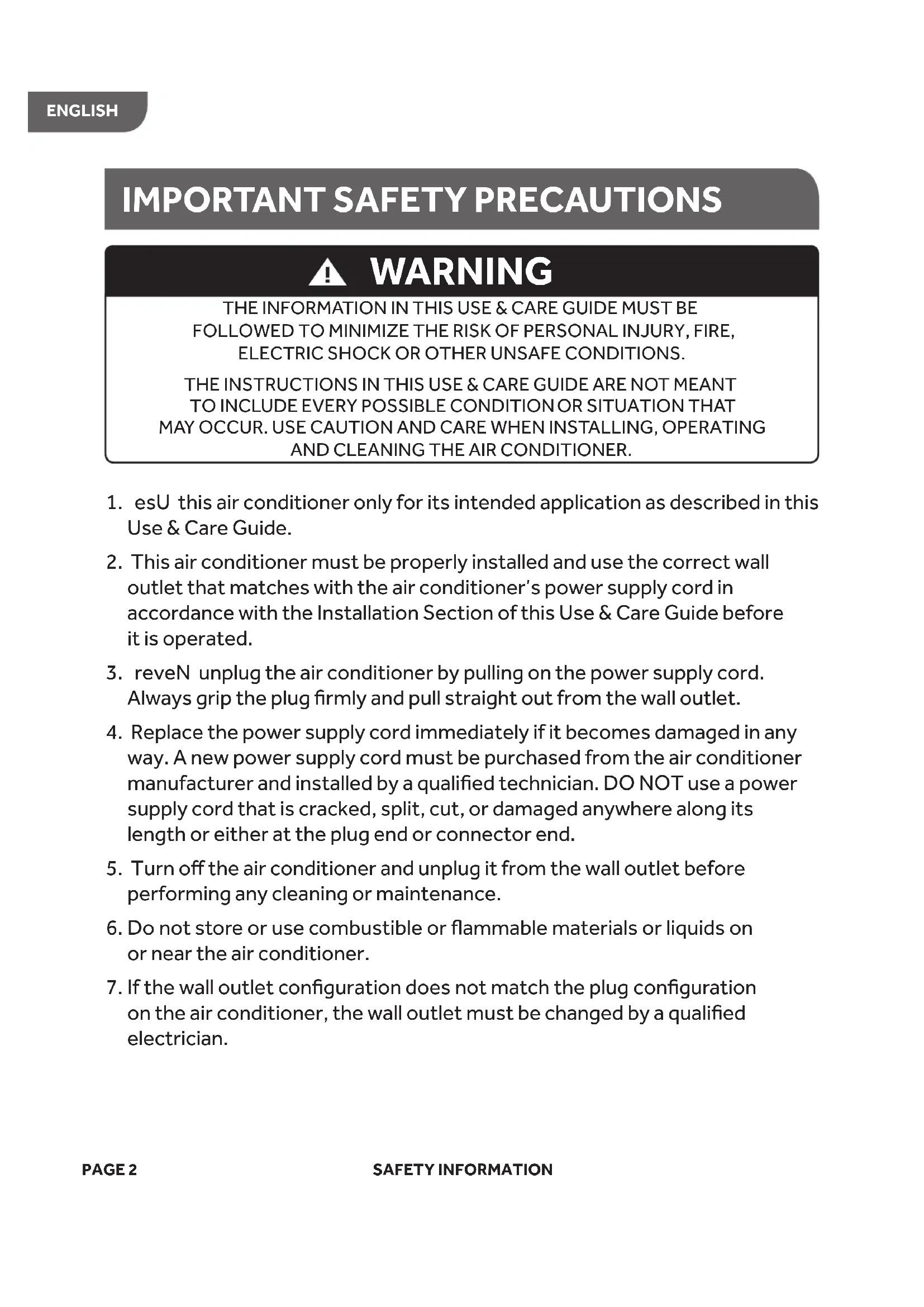 2. This air conditioner must be properly installed and use the correct wall