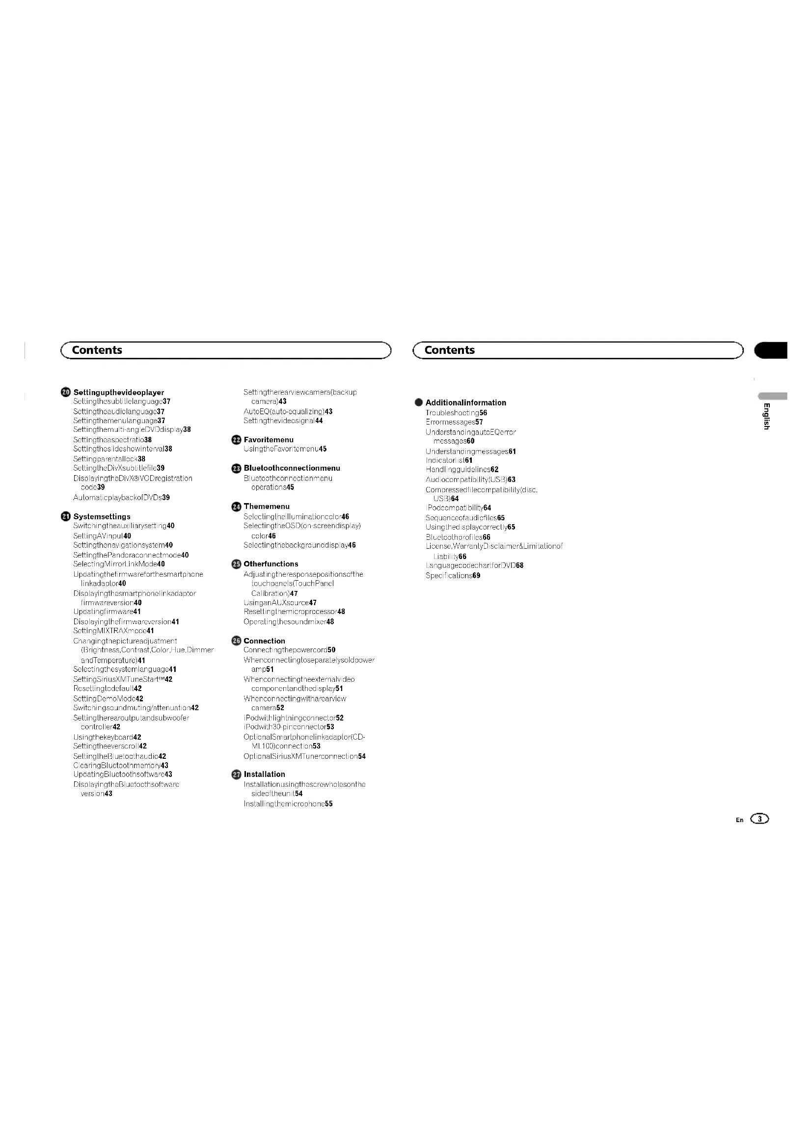 <CRD4758-A>56Black plate (57,1) Playback is not performed with the audio language and subtitle language settings selected in Video Setup menu. The DVD being played does not feature dialog or sub- titles in the selected language. The language cannot be switched if the selected language is not recorded on the disc. The viewing angle cannot be switched. The DVD being played does not feature scenes shot from multiple angles. The viewing angle cannot be switched if the DVD does not feature scenes recorded from multiple angles. You are trying to switch to multi-angle viewing for a scene that was not recorded from multiple angles. Switch between multiple angles when watching scenes recorded from multiple angles. The image is extremely unclear/distorted and dark during playback. Some discs feature a signal to prohibit copying. Since this unit is compatible with the analog copy generation management system, when playing a disc that has a signal prohibiting copying, horizontal stripes or other imperfections may appear when viewed on some displays. This is not a malfunction. Video CD The PBC (playback control) menu cannot be called up. The Video CD being played does not feature PBC. This operation is not available for Video CDs that do not feature PBC. Repeat play and track/time search are not possible. The Video CD being played features PBC. This operation is not available for Video CDs that feature PBC. iPod The iPod does not operate correctly. The cables are incorrectly connected. Disconnect the cable from the iPod. Once the iPod’s main menu is displayed, reconnect the iPod and reset it. The iPod version is old. Update the iPod version. Sound from the iPod cannot be heard. The audio output direction may switch automatically when the Bluetooth and USB connections are used at the same time. Use the iPod to change the audio output direction. Bluetooth audio/telephone The sound from the Bluetooth audio source is not played back. There is a call in progress on a Bluetooth connected cellular phone. The sound will be played back when the call is terminated. A Bluetooth connected cellular phone is currently being operated. Do not use the cellular phone at this time. A call was made with a Bluetooth connected cellular phone and then immediately terminated. As a result, communication between this unit and the cellular phone was not terminated properly. Reconnect the Bluetooth connection between this unit and the cellular phone. Error messages When you contact your dealer or your nearest Pioneer Service Center, be sure to note the error message. Error messages are written in bold and causes in regular, non-indented text. Regular, indented text is used to indicate actions to be taken. Common AMP Error This unit fails to operate or the speaker connection is incorrect; the protective circuit is activated. Check the speaker connection. If the message fails to disappear even after the engine is switched off/on, contact your dealer or an authorized Pioneer Service Station for assistance. Tuner No Data Provided This unit cannot receive artist name/song title infor- mation. Move to the desirable location with good reception. No Data This unit cannot receive program service name infor- mation. Move to the desirable location with good reception. SiriusXM Satellite Radio Check Antenna The antenna connection is incorrect. Check the antenna connection. If the message fails to disappear even after the engine is switched off/on, contact your dealer or an authorized Pioneer Service Station for assistance. Check Tuner The SiriusXM Connect Vehicle Tuner connection is incorrect or the power failed. Check the tuner connection and battery voltage. If the message fails to disappear even after the engine is switched off/on, contact your dealer or an authorized Pioneer Service Station for assistance. No Signal The SiriusXM Connect Vehicle Tuner is having diffi- culty receiving the SiriusXM satellite signal. ! Verify that your vehicle is outdoors with a clear view of the southern sky. ! Verify that the SiriusXM magnetic mount antenna is mounted on a metal surface on the outside the vehicle. ! Move the SiriusXM antenna away from any obstructions. Subscription Updated This unit has detected a change in your SiriusXM subscription status. Press any key to clear the message. Not Available The channel that you have requested is not a valid SiriusXM channel. Check the SiriusXM channel lineup. English Additional information