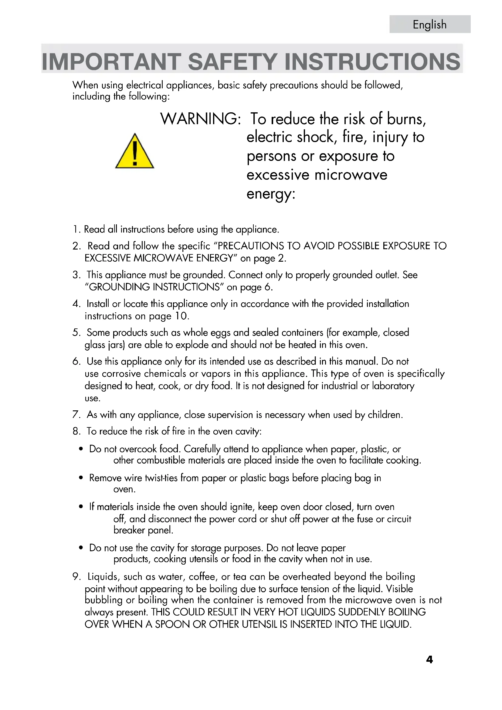point without appearing to be boiling due to surface tension of the liquid. Visible bubbling or boiling when the container is removed from the microwave oven is not always present. THIS COULD RESULT IN VERY HOT LIQUIDS SUDDENLY BOILING OVER WHEN A SPOON OR OTHER UTENSIL IS INSERTED INTO THE LIQUID.