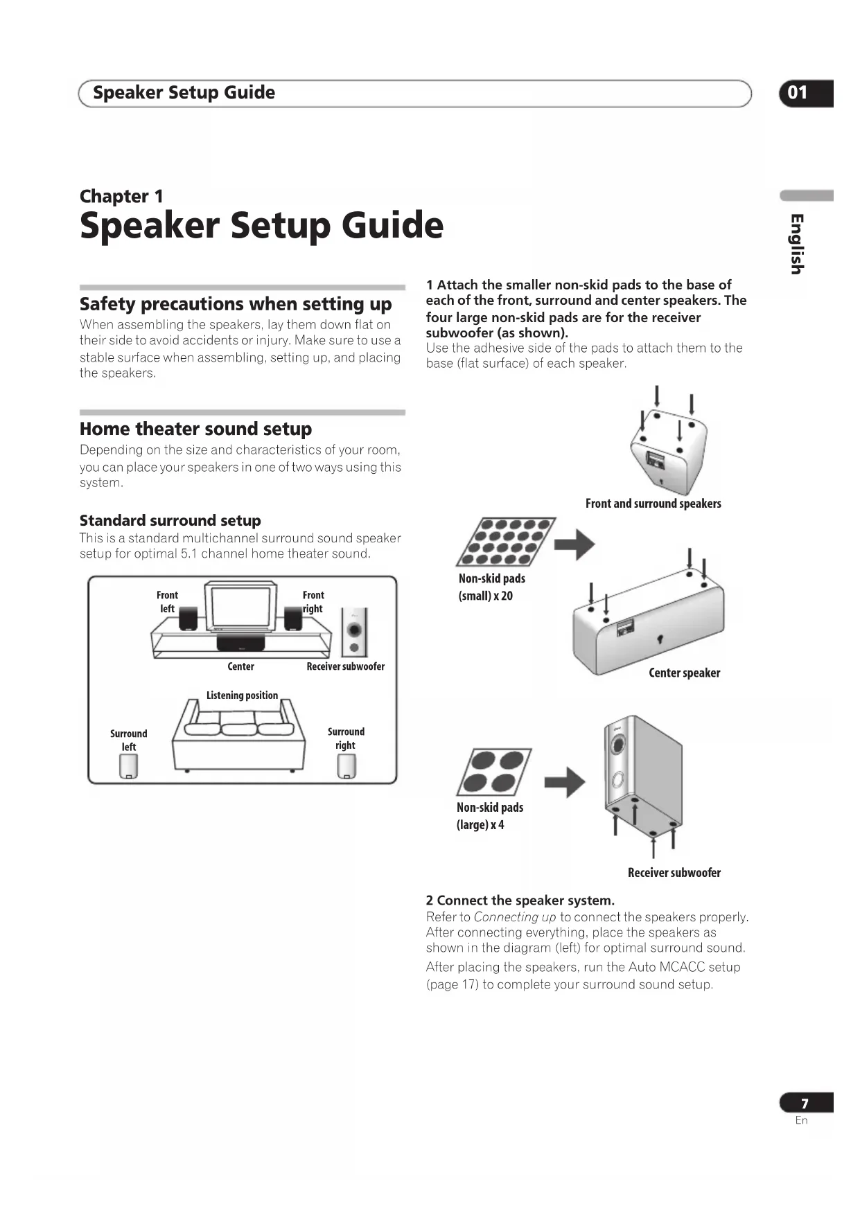 Speaker Setup Guide Safety precautions when setting up When assembling the speakers, lay them down flat on their side to avoid accidents or injury. Make sure to use a stable surface when assembling, setting up, and placing the speakers. Home theater sound setup Depending on the size and characteristics of your room, you can place your speakers in one of two ways using this system. Standard surround setup This is a standard multichannel surround sound speaker setup for optimal 5.1 channel home theater sound. 1 Attach the smaller non-skid pads to the base of each of the front, surround and center speakers. The four large non-skid pads are for the receiver subwoofer (as shown). Use the adhesive side of the pads to attach them to the base (flat surface) of each speaker. 2 Connect the speaker system. Refer to Connecting up to connect the speakers properly. After connecting everything, place the speakers as shown in the diagram (left) for optimal surround sound.After placing the speakers, run the Auto MCACC setup (page 17) to complete your surround sound setup. Receiver subwoofer Front left Surround left Listening position Center Listening position Front right Surround right Non-skid pads (small) x 20 Front and surround speakers Center speaker Non-skid pads (large) x 4 Receiver subwoofer SX-SW260_KU.book Page 7 Wednesday, March 29, 2006 2:43 PMSpeaker Setup Guide