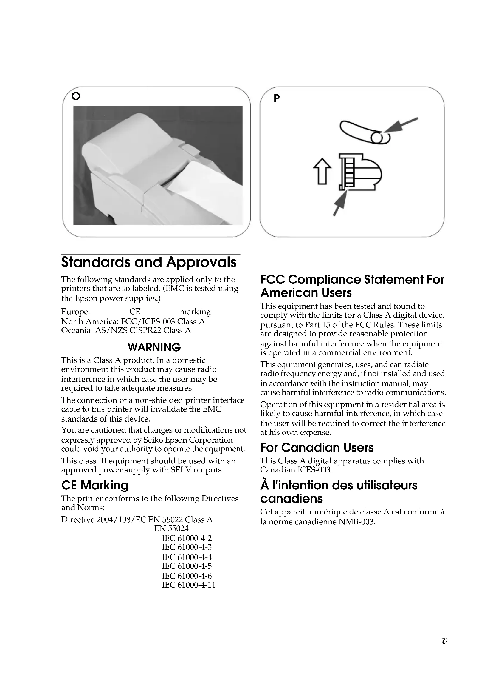 MNv Standards and Approvals The following standards are applied only to the printers that are so labeled. (EMC is tested using the Epson power supplies.) Europe: CE marking North America: FCC/ICES-003 Class A Oceania: AS/NZS CISPR22 Class A WARNING This is a Class A product. In a domestic environment this product may cause radio interference in which case the user may be required to take adequate measures. The connection of a non-shielded printer interface cable to this printer will invalidate the EMC standards of this device. You are cautioned that changes or modifications not expressly approved by Seiko Epson Corporation could void your authority to operate the equipment. This class III equipment should be used with an approved power supply with SELV outputs. CE Marking The printer conforms to the following Directives and Norms: Directive 2004/108/EC EN 55022 Class A EN 55024