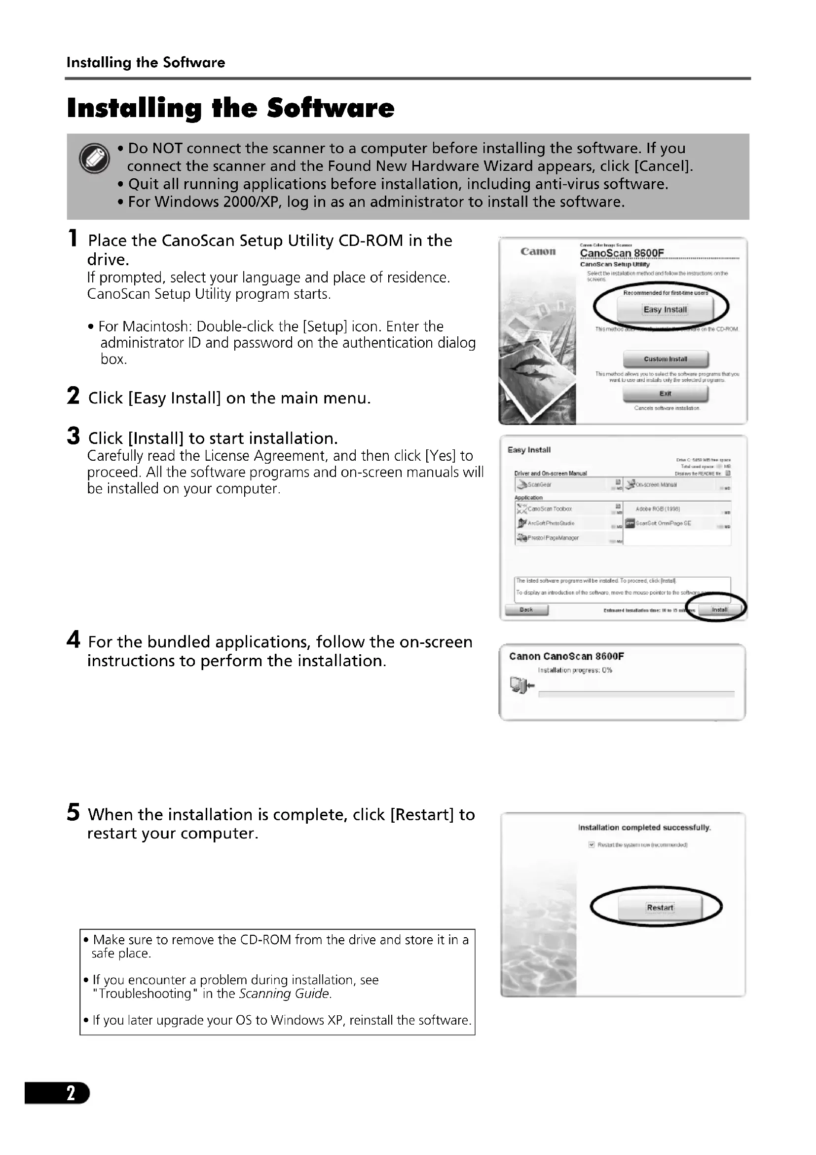 - Before using scanner buttons, make sure that all the software programs are installed on your computer using the [Easy Install] option of the CanoScan Setup Utility program. See "Installing the Software" on page 2.