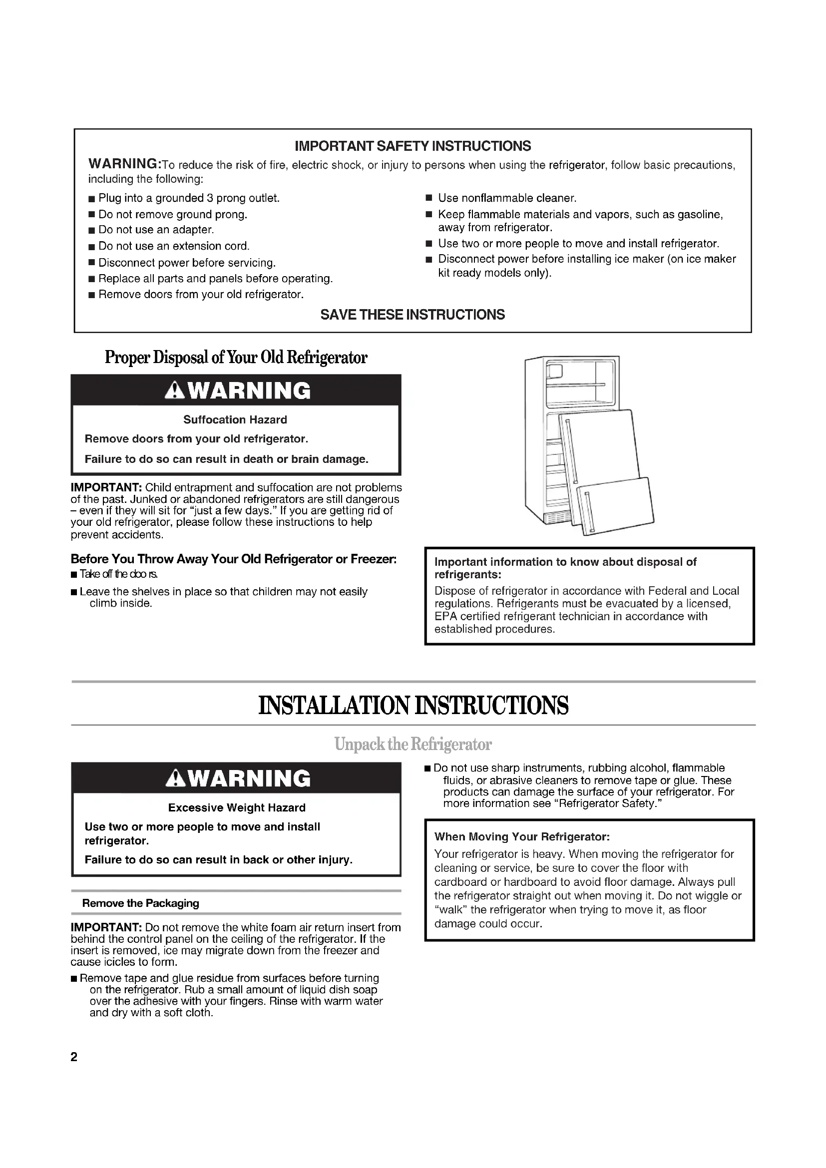 W10359303AYou can be killed or seriously injured if you don't immediately You can be killed or seriously injured if you don'tfollow All safety messages will tell you what the potential hazard is, tell you how to reduce the chance of injury, and tell you what can happen if the instructions are not followed. Your safety and the safety of others are very important. We have provided many important safety messages in this manual and on your appliance. Always read and obey all safety messages.This is the safety alert symbol.This symbol alerts you to potential hazards that can kill or hurt you and others.All safety messages will follow the safety alert symbol and either the word “DANGER” or “WARNING.”These words mean:follow instructions.instructions. DANGER WARNING2 INSTALLATION INSTRUCTIONS Unpack the Refrigerator Remove the Packaging IMPORTANT: Do not remove the white foam air return insert from behind the control panel on the ceiling of the refrigerator. If the insert is removed, ice may migrate down from the freezer and cause icicles to form.■ Remove tape and glue residue from surfaces before turning on the refrigerator. Rub a small amount of liquid dish soap over the adhesive with your fingers. Rinse with warm water and dry with a soft cloth.■ Do not use sharp instruments, rubbing alcohol, flammable fluids, or abrasive cleaners to remove tape or glue. These products can damage the surface of your refrigerator. For more information see “Refrigerator Safety.” Proper Disposal of Your Old Refrigerator IMPORTANT: Child entrapment and suffocation are not problems of the past. Junked or abandoned refrigerators are still dangerous – even if they will sit for “just a few days.” If you are getting rid of your old refrigerator, please follow these instructions to help prevent accidents. Before You Throw Away Your Old Refrigerator or Freezer: ■ Take off the doo rs.■ Leave the shelves in place so that children may not easily climb inside.