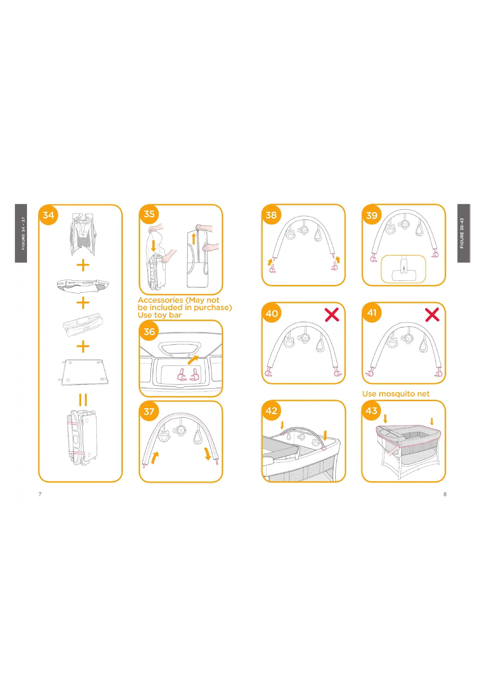 Parts List (Optional) Make sure all parts are available before assembly. Accessories may be sold separately or may not beavailable depending on region. If any part is missing, please contact local retailer. No tools are required for assembly. 1 Toy2 Toy Bar3 Mosquito Net