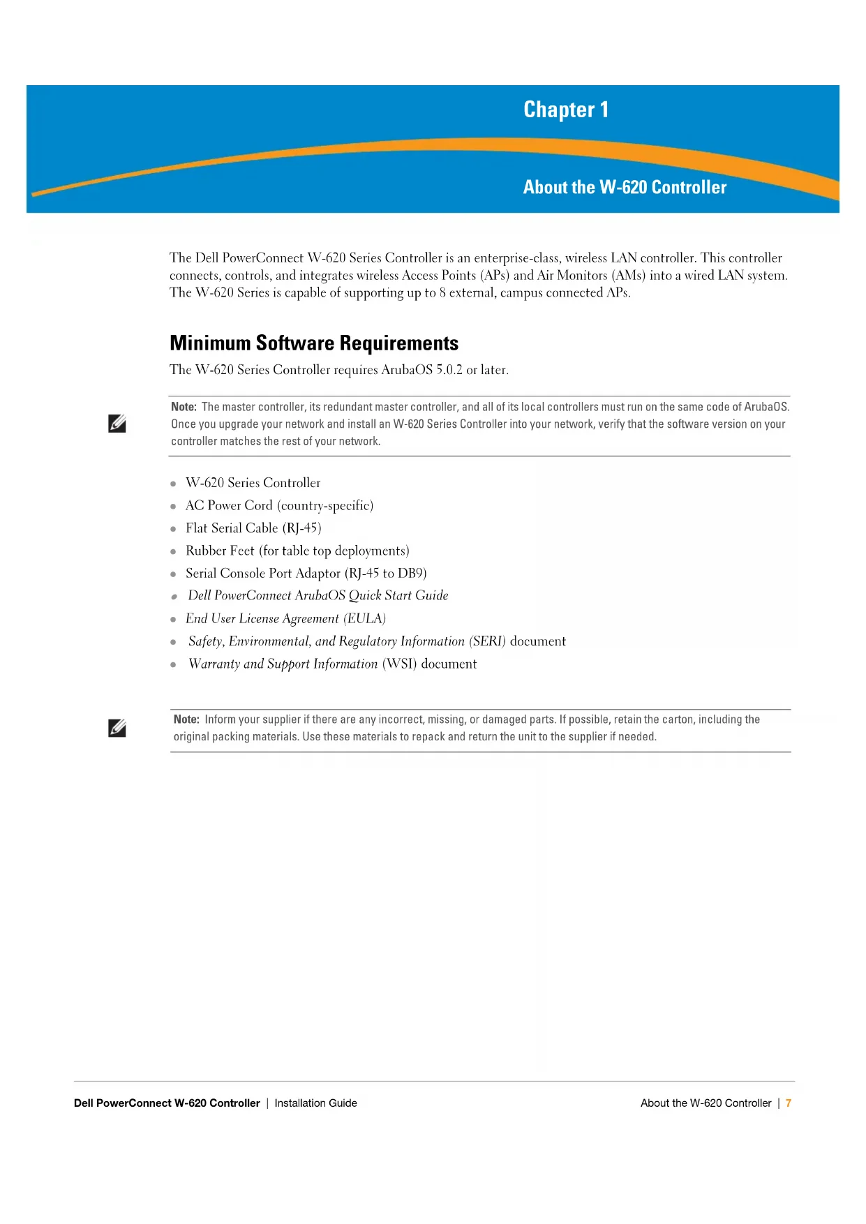 About the W-620 Controller The Dell PowerConnect W-620 Series Controller is an enterprise-class, wireless LAN controller. This controller connects, controls, and integrates wireless Access Points (APs) and Air Monitors (AMs) into a wired LAN system. The W-620 Series is capable of supporting up to 8 external, campus connected APs. Minimum Software Requirements The W-620 Series Controller requires ArubaOS 5.0.2 or later. z W-620 Series Controllerz AC Power Cord (country-specific)z Flat Serial Cable (RJ-45)z Rubber Feet (for table top deployments)z Serial Console Port Adaptor (RJ-45 to DB9)