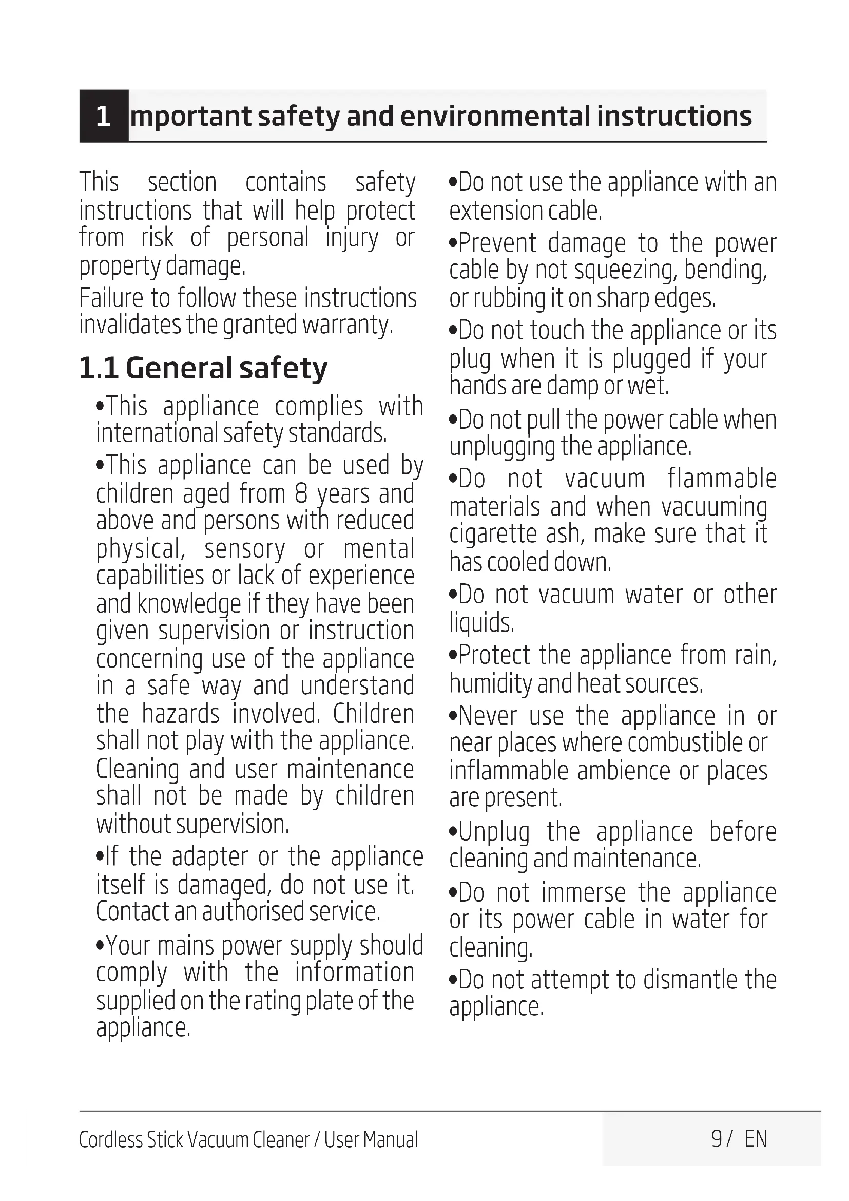 - Do not attempt to dsmantle the applance. 1 Important safety and environmental instructions10 / 14 EN Cordless Stick Vacuum Cleaner / User Manual 10 / EN