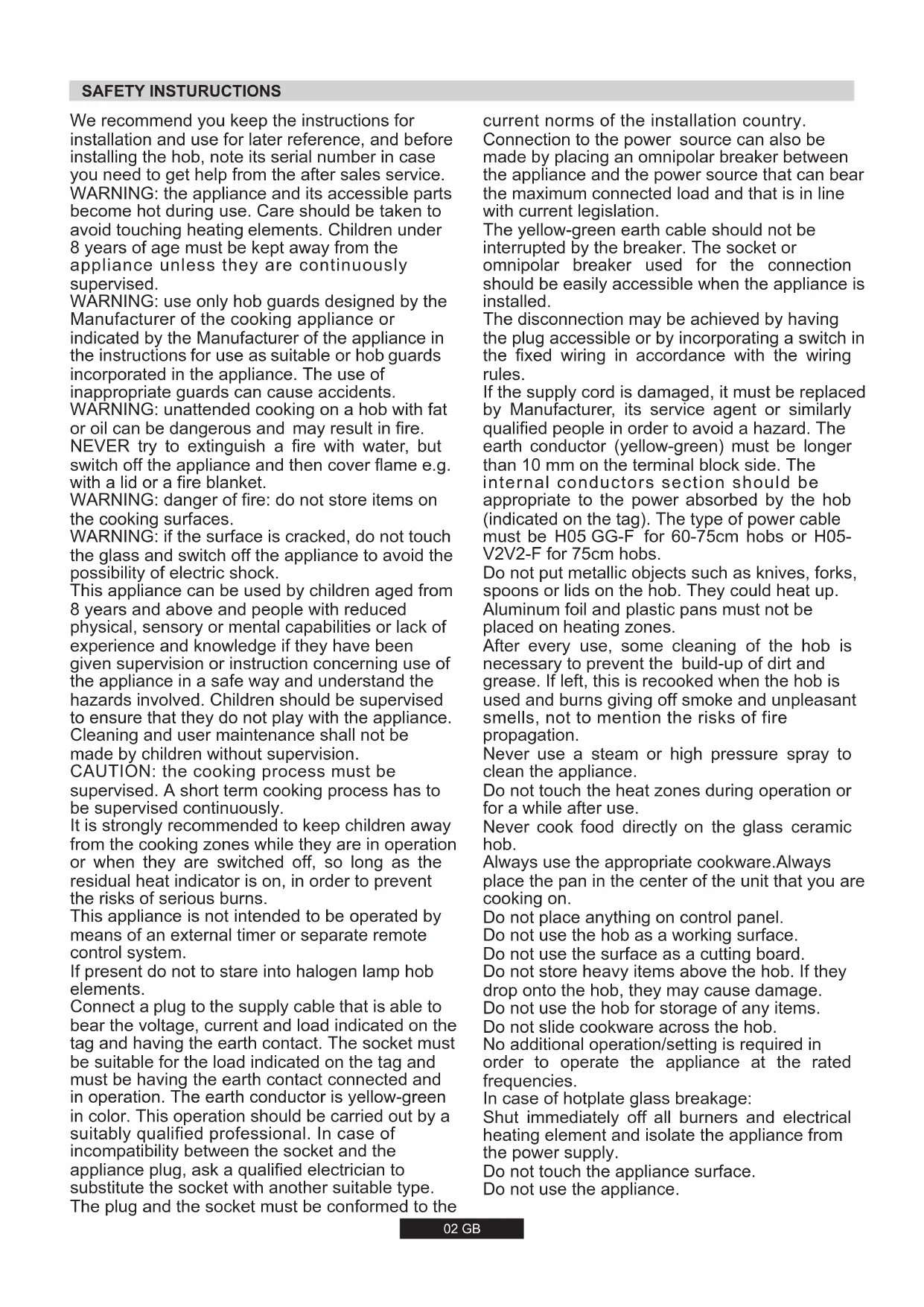 the cooking surfaces. This appliance is not intended to be operated by means of an external timer or separate remote control system. It is strongly recommended to keep children away from the cooking zones while they are in operation or when they are switched off, so long as the residual heat indicator is on, in order to prevent the risks of serious burns. We recommend you keep the instructions for installation and use for later reference, and before installing the hob, note its serial number in case you need to get help from the after sales service.