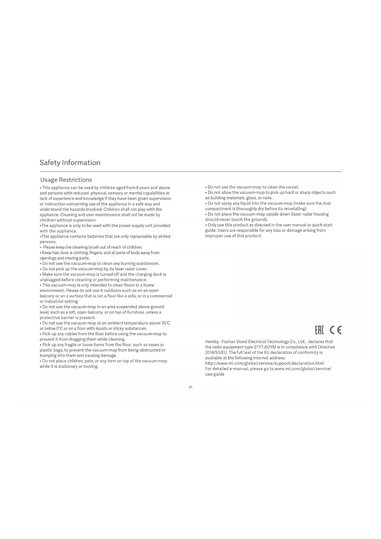 Hereby, Foshan Viomi Electrical Technology Co., Ltd., declares that the radio equipment type STYTJ02YM is in compliance with Directive 2014/53/EU. The full text of the EU declaration of conformity is available at the following internet address: hp://www.mi.com/global/service/support/declaration.html For detailed e-manual, please go to www.mi.com/global/service/ userguide