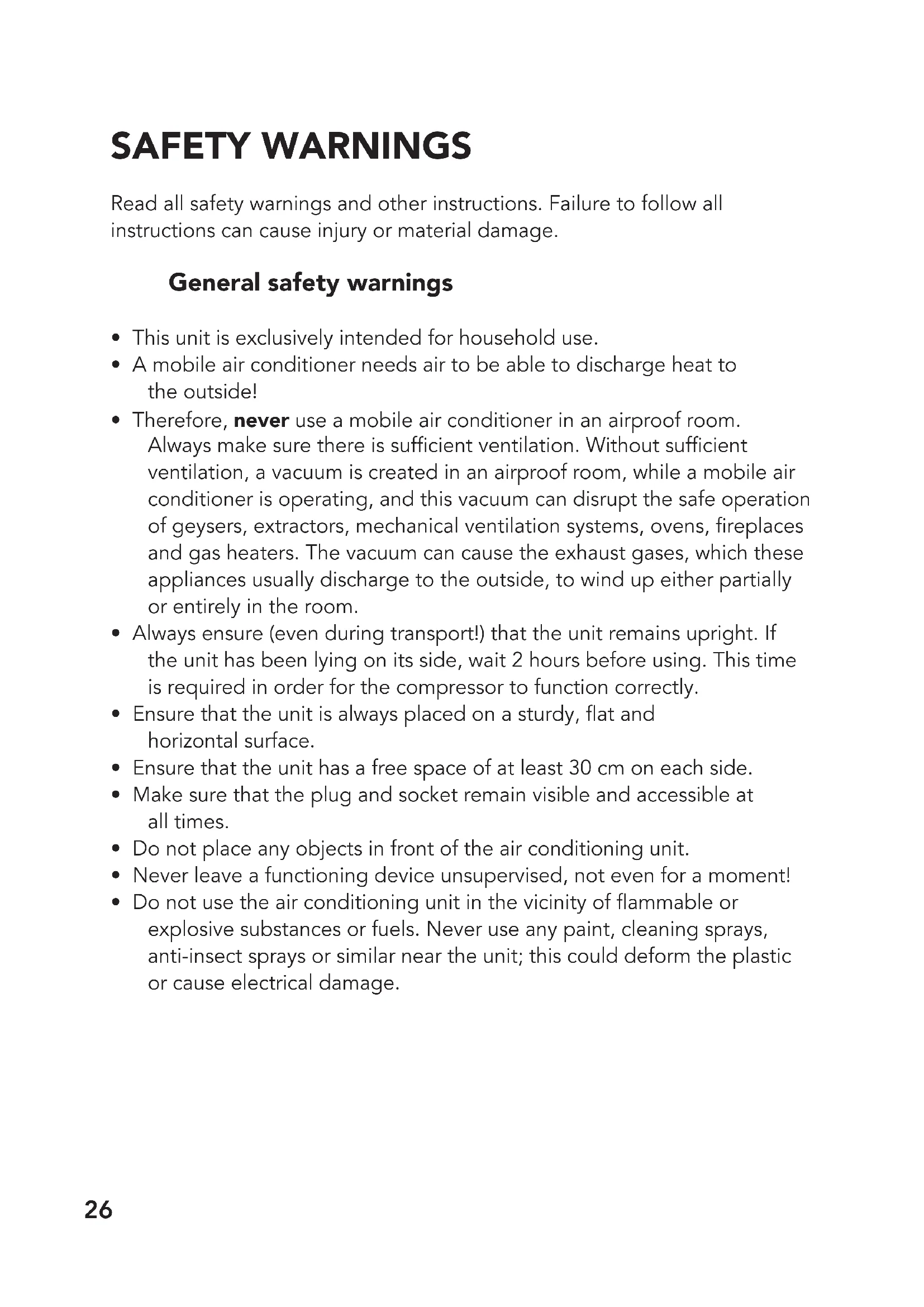 - Therefore, never use a mobile air conditioner in an airproof room. Always make sure there is sufcient ventilation. Without sufcient ventilation, a vacuum is created in an airproof room, while a mobile air conditioner is operating, and this vacuum can disrupt the safe operation of geysers, extractors, mechanical ventilation systems, ovens, replaces and gas heaters. The vacuum can cause the exhaust gases, which these appliances usually discharge to the outside, to wind up either partially or entirely in the room.