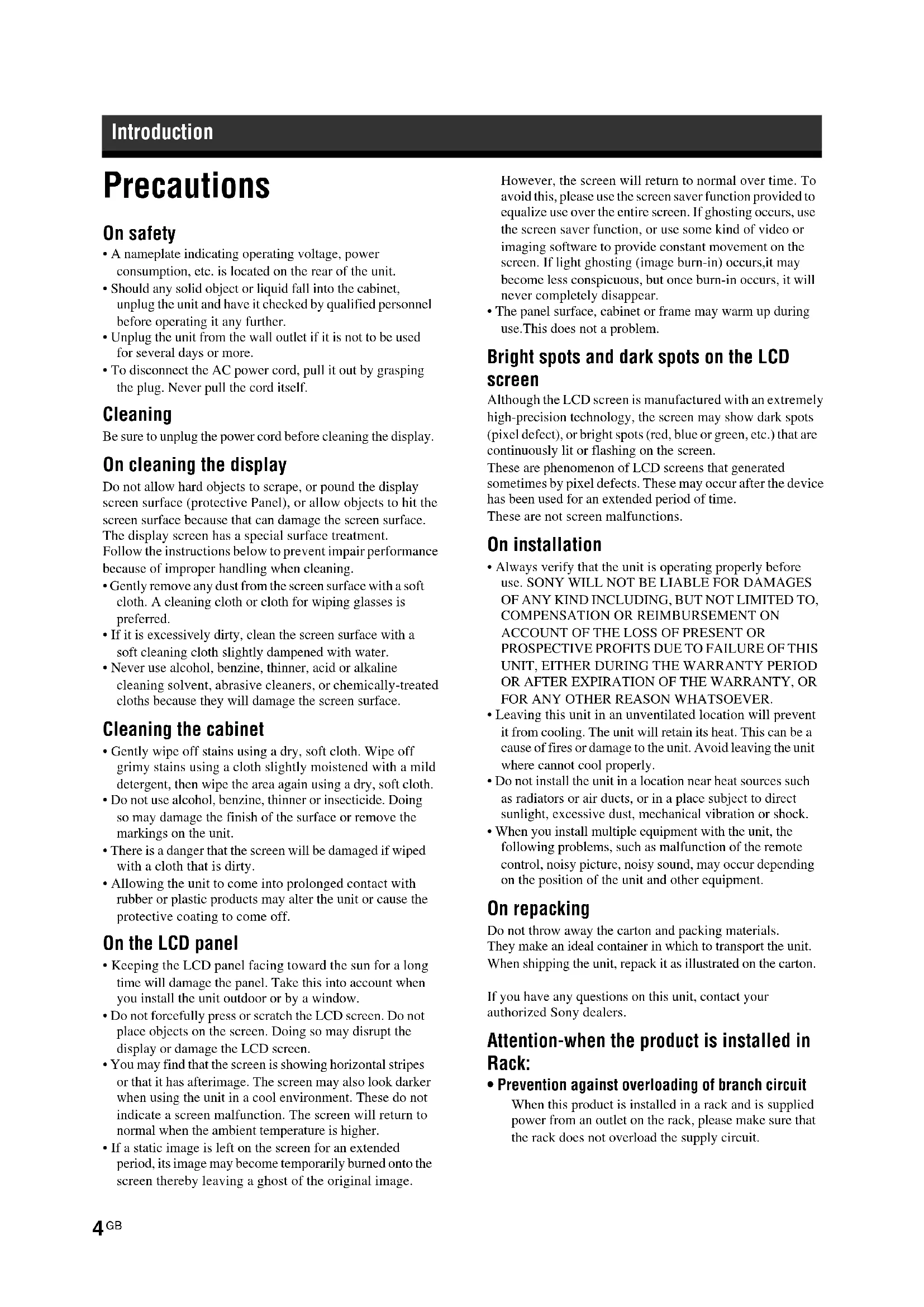 WARNING Owner’s Record The model and serial numbers are located on the rear. Record the model and serial numbers in the spaces provided below. Refer to these numbers whenever you call upon your Sony dealer regarding this product. Model No. Serial No. To reduce the risk of fire or electric shock, do not expose this apparatus to rain or moisture. To avoid electrical shock, do not open the cabinet. Refer servicing to qualified personnel only. THIS APPARATUS MUST BE EARTHED. On transportation When you carry the display unit, hold the unit itself, not the speakers. If you fail to do so, the speakers may come out of the unit and the unit may fall. This can cause injury. For customers in the U.S.A. If you have any questions about this product, you may call; Sony Customer Information Services Center 1-800-222-7669 or http://www.sony.com/ This device complies with Part 15 of the FCC Rules. Operation is subject to the following two conditions: (1) This device may not cause harmful interference, and (2) this device must accept any interference received, including interference that may cause undesired operation. This equipment has been tested and found to comply with the limits for a Class B digital device, pursuant to