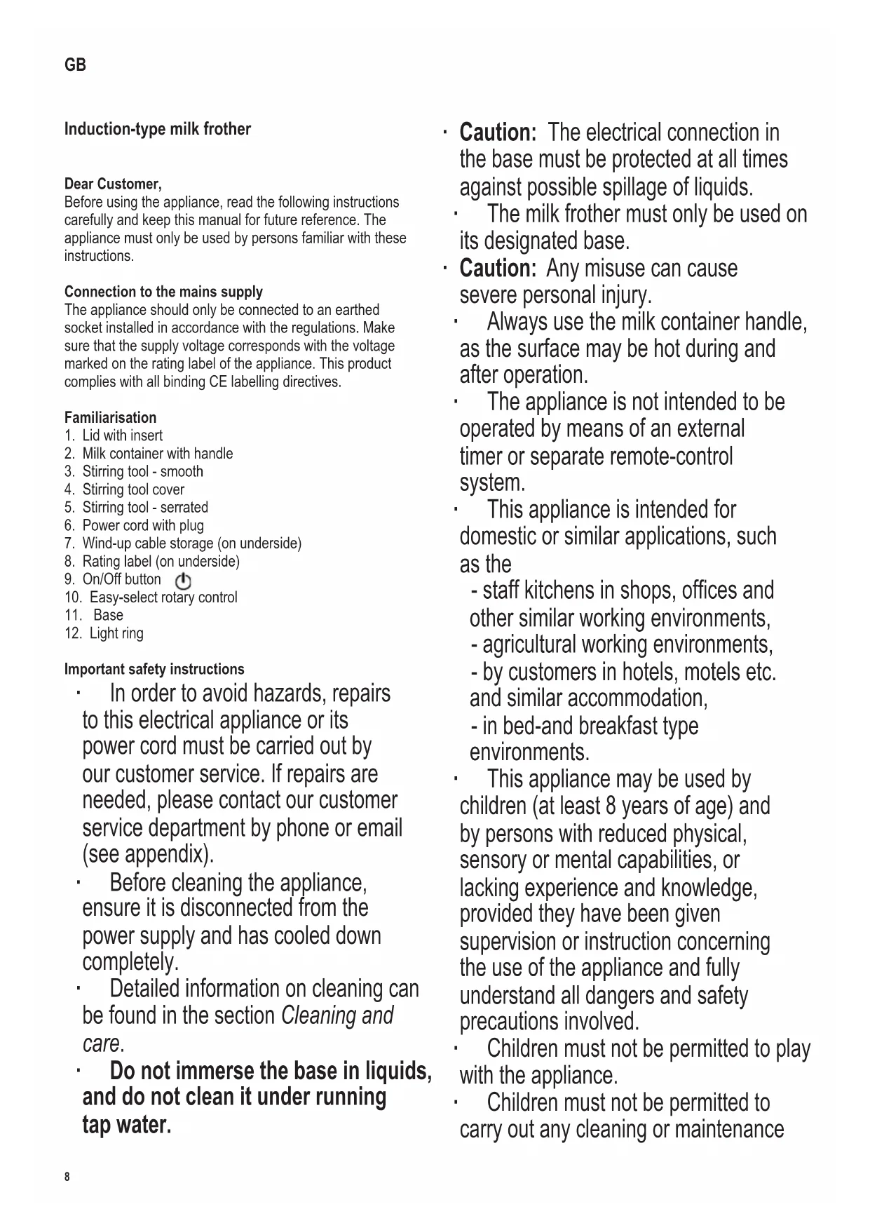 Important safety instructions ∙ In order to avoid hazards, repairs to this electrical appliance or its power cord must be carried out by our customer service. If repairs are needed, please contact our customer service department by phone or email (see appendix). ∙ Before cleaning the appliance, ensure it is disconnected from the power supply and has cooled down completely. ∙ Detailed information on cleaning can be found in the section Cleaning and care. ∙ Do not immerse the base in liquids, and do not clean it under running tap water. ∙ Caution: The electrical connection in the base must be protected at all times against possible spillage of liquids. ∙ The milk frother must only be used on its designated base. ∙ Caution: Any misuse can cause severe personal injury. ∙ Always use the milk container handle, as the surface may be hot during and after operation. ∙ The appliance is not intended to be operated by means of an external timer or separate remote-control system. ∙ This appliance is intended for domestic or similar applications, such as the - staffkitchensinshops,ofcesand other similar working environments, - agricultural working environments, - by customers in hotels, motels etc. and similar accommodation, - in bed-and breakfast type environments. ∙ This appliance may be used by children (at least 8 years of age) and by persons with reduced physical, sensory or mental capabilities, or lacking experience and knowledge, provided they have been given supervision or instruction concerning the use of the appliance and fully understand all dangers and safety precautions involved. ∙ Children must not be permitted to play with the appliance. ∙ Children must not be permitted to carry out any cleaning or maintenance GB9 142 x 208 mm work on the appliance unless they are supervised and at least 8 years of age. ∙ The appliance and its power cord must be kept well away from children under 8 at all times. ∙ Caution: Keep any packaging materials well away from children – such materials are a potential source of danger, e.g. of suffocation. ∙ Every time the appliance is used, the main body includingthepowercordaswellasanyattachmenttted should be checked thoroughly for any defects. Should the appliance, for instance, have been dropped onto a hard surface, or if excessive force has been used to pull the power cord, it must no longer be used: even invisible damage may have adverse effects on the operational safety of the appliance. ∙ This appliance is solely designed for heating up and frothing milk, hot chocolate and cocoa. Do not put any other type of liquid or solid food in the container. ∙ Do not leave the milk frother unattended while in use. ∙ Always observe the min and max level marks inside the milk container for each application. ∙ The protrusion in the bottom of the container (min. level mark) must be covered by the milk. If there is not enough milk, the appliance may overheat. ∙ Overllingthecontainermaycausedangeriffrothing milk is forced out. ∙ Caution: Thelidmustalwaysbettedduringoperation. ∙ Do not cover the ventilation slots at the rear of the appliance. ∙ The appliance may only be used with the original accessory parts provided by the manufacturer. ∙ Theappliancemustalwaysbesetonarm,level surface. ∙ Do not allow the appliance or its power cord to come intocontactwithopenamesoranyhotsurfacessuch as hot-plates. ∙ Do not allow the power cord to hang free; the cord must be kept well away from hot parts of the appliance. ∙ Always remove the plug from the wall socket - in case of any malfunction, - after use, - before cleaning the appliance. ∙ When removing the plug from the wall socket, never pull on the power cord; always grip the plug itself. ∙ No responsibility is accepted if damage results from improper use, or if these instructions are not complied with. Before using for the rst time ∙ Remove any remaining packaging materials and promotional stickers, and check that all components are present. ∙ Beforetheapplianceisusedforthersttime,orafter extended periods of non-use, it should be thoroughly cleaned as described in the section Cleaning and care. Wind-up power cord storage ∙ There is a power-cord storage compartment in the base. ∙ Unwind the cord to the required length before use. ∙ Wind up the power cord again after use. Operation Lid ∙ Thelidmustalwaysbettedduringoperation. ∙ To add ingredients during operation, turn and then take off the lid insert. ∙ Forstorage,thesmoothstirringtoolcanbettedtothe lid insert. Light ring Red A function with heating is selected. Blue A function without heating is selected. Steady light Preparation is in progress. Flashing red or blue The unit is waiting for an input, preparation is complete, or an error has occurred (see Trouble shooting at the end of the instructions). Selecting the stirring tool The following stirring tools are available: è smooth è serrated