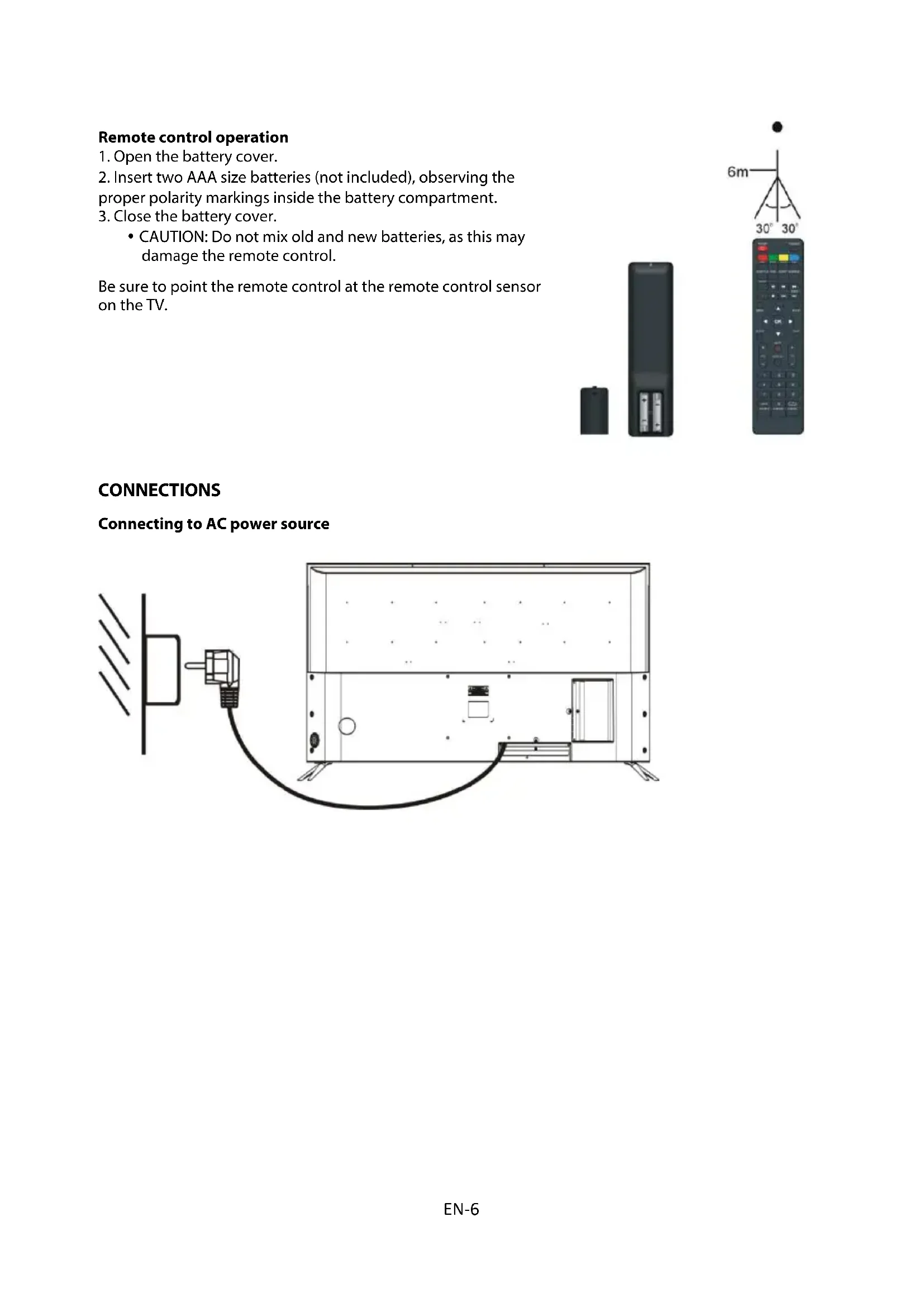 CAUTION: Do not mix old and new batteries, as this may damage the remote control. Be sure to point the remote control at the remote control sensor on the TV.