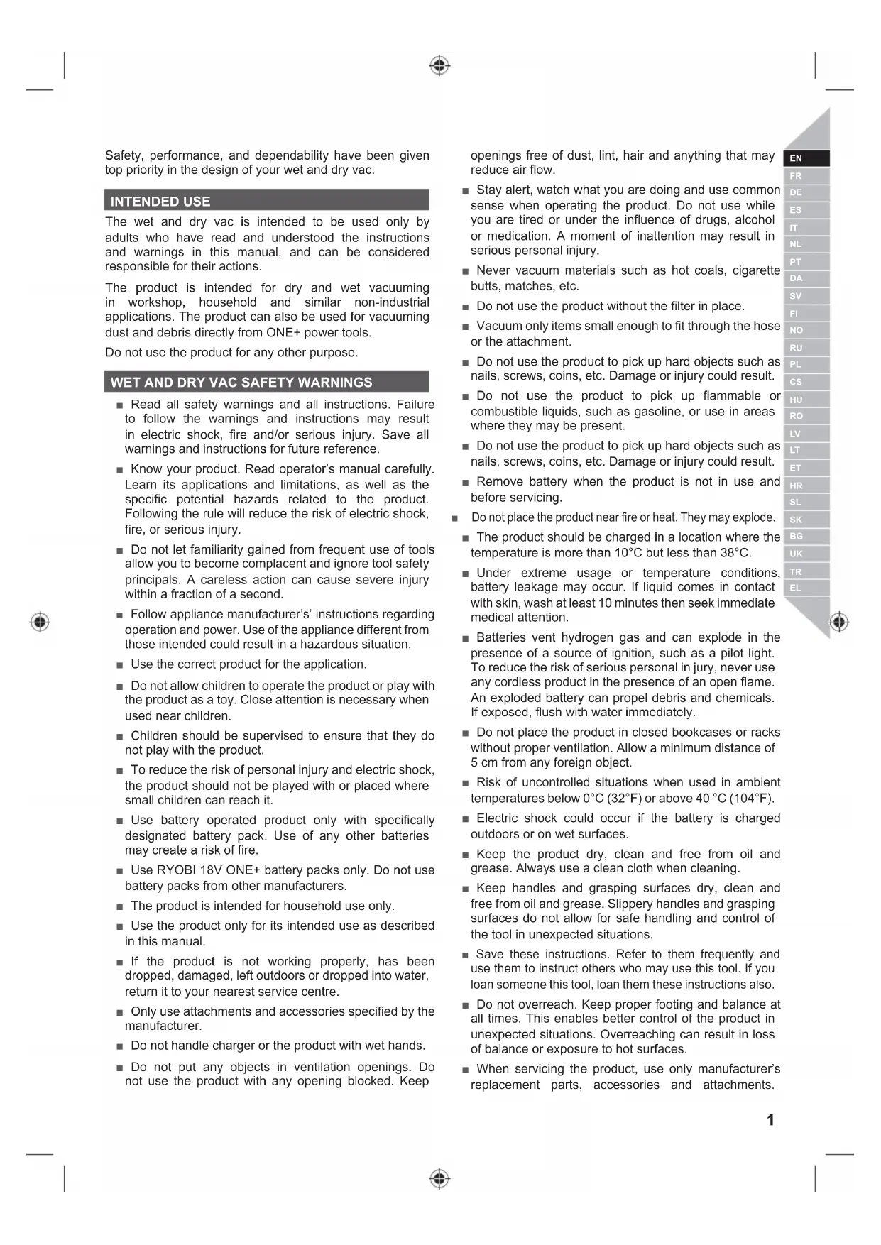 ■ Read all safety warnings and all instructions. Failure to follow the warnings and instructions may result in electric shock, fire and/or serious injury. Save all warnings and instructions for future reference. ■ Know your product. Read operator’s manual carefully. Learn its applications and limitations, as well as the specific potential hazards related to the product. Following the rule will reduce the risk of electric shock, fire, or serious injury. ■ Do not let familiarity gained from frequent use of tools allow you to become complacent and ignore tool safety principals. A careless action can cause severe injury within a fraction of a second. ■ Follow appliance manufacturer’s’ instructions regarding operation and power. Use of the appliance different from those intended could result in a hazardous situation. ■ Use the correct product for the application. ■ Do not allow children to operate the product or play with the product as a toy. Close attention is necessary when used near children. ■ Children should be supervised to ensure that they do not play with the product. ■ To reduce the risk of personal injury and electric shock, the product should not be played with or placed where small children can reach it. ■ Use battery operated product only with specifically designated battery pack. Use of any other batteries may create a risk of fire. ■ Use RYOBI 18V ONE+ battery packs only. Do not use battery packs from other manufacturers. ■ The product is intended for household use only. ■ Use the product only for its intended use as described in this manual. ■ If the product is not working properly, has been dropped, damaged, left outdoors or dropped into water, return it to your nearest service centre. ■ Only use attachments and accessories specified by the manufacturer. ■ Do not handle charger or the product with wet hands. ■ Do not put any objects in ventilation openings. Do not use the product with any opening blocked. Keep openings free of dust, lint, hair and anything that may reduce air flow. ■ Stay alert, watch what you are doing and use common sense when operating the product. Do not use while you are tired or under the influence of drugs, alcohol or medication. A moment of inattention may result in serious personal injury. ■ Never vacuum materials such as hot coals, cigarette butts, matches, etc. ■ Do not use the product without the filter in place. ■ Vacuum only items small enough to fit through the hose or the attachment. ■ Do not use the product to pick up hard objects such as nails, screws, coins, etc. Damage or injury could result. ■ Do not use the product to pick up flammable or combustible liquids, such as gasoline, or use in areas where they may be present. ■ Do not use the product to pick up hard objects such as nails, screws, coins, etc. Damage or injury could result. ■ Remove battery when the product is not in use and before servicing. ■ Do not place the product near fire or heat. They may explode. ■ The product should be charged in a location where the temperature is more than 10°C but less than 38°C. ■ Under extreme usage or temperature conditions, battery leakage may occur. If liquid comes in contact with skin, wash at least 10 minutes then seek immediate medical attention. ■ Batteries vent hydrogen gas and can explode in the presence of a source of ignition, such as a pilot light. To reduce the risk of serious personal in jury, never use any cordless product in the presence of an open flame. An exploded battery can propel debris and chemicals. If exposed, flush with water immediately. ■ Do not place the product in closed bookcases or racks without proper ventilation. Allow a minimum distance of 5 cm from any foreign object. ■ Risk of uncontrolled situations when used in ambient temperatures below 0°C (32°F) or above 40 °C (104°F). ■ Electric shock could occur if the battery is charged outdoors or on wet surfaces. ■ Keep the product dry, clean and free from oil and grease. Always use a clean cloth when cleaning. ■ Keep handles and grasping surfaces dry, clean and free from oil and grease. Slippery handles and grasping surfaces do not allow for safe handling and control of the tool in unexpected situations. ■ Save these instructions. Refer to them frequently and use them to instruct others who may use this tool. If you loan someone this tool, loan them these instructions also. ■ Do not overreach. Keep proper footing and balance at all times. This enables better control of the product in unexpected situations. Overreaching can result in loss of balance or exposure to hot surfaces. ■ When servicing the product, use only manufacturer’s replacement parts, accessories and attachments.2 | English Follow instructions in the Maintenance section of the manual. Use of unauthorised parts or failure to follow maintenance instructions may create a risk of shock or injury.